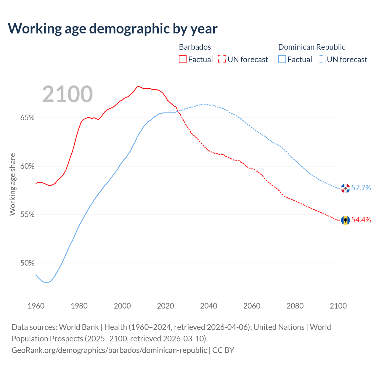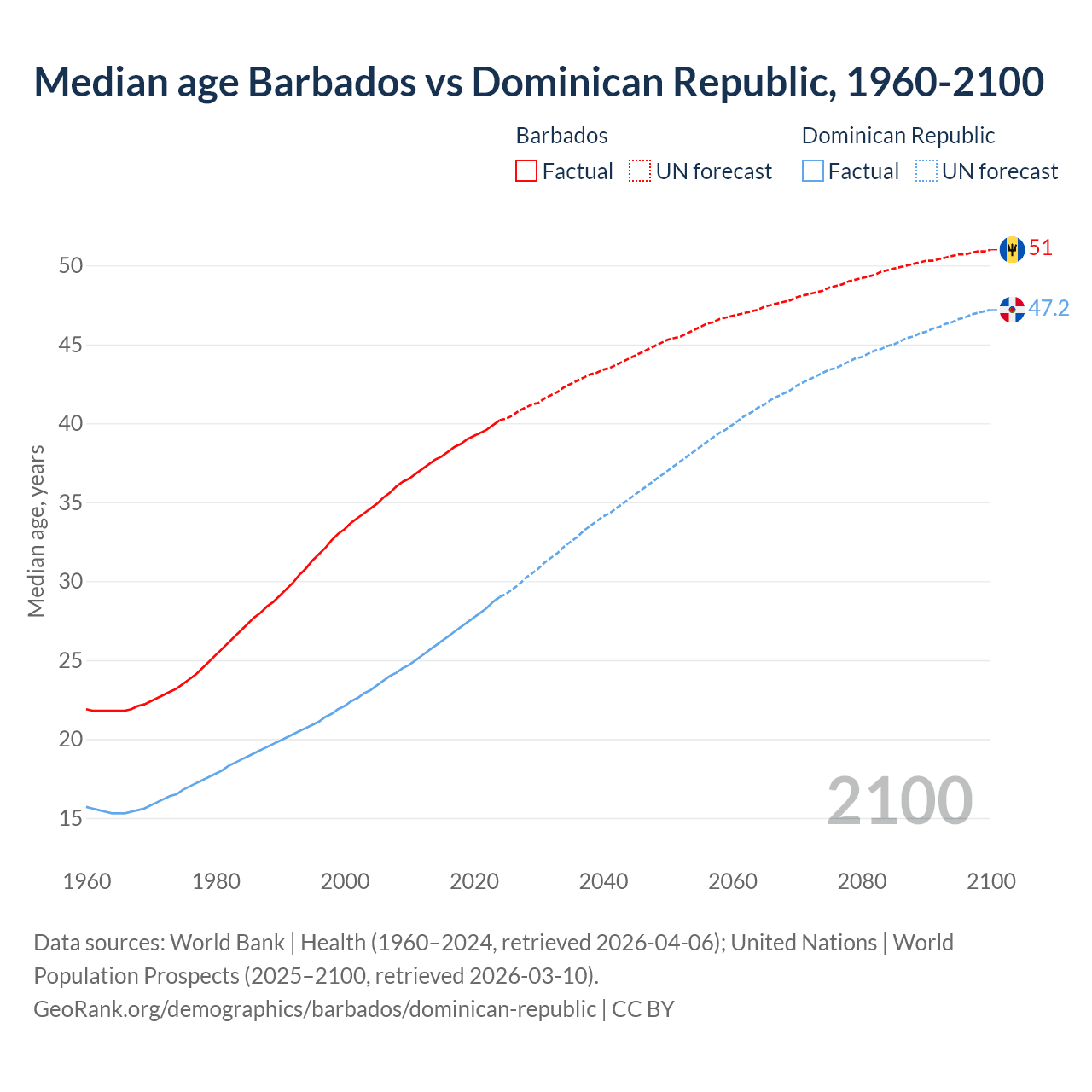 Median age Barbados vs Dominican Republic, 1960-2100