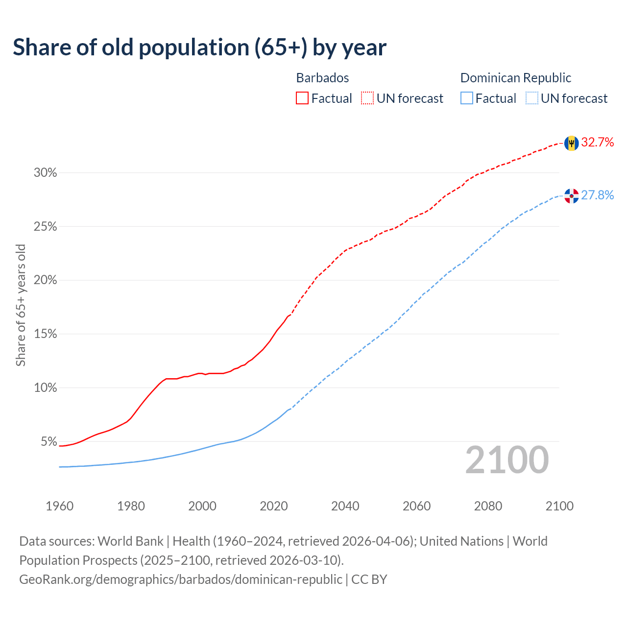 The share of older people aged 65 and over is 16.6% in Barbados and 7.88% in the Dominican Republic. Life expectancy in Barbados compared to the Dominican Republic .