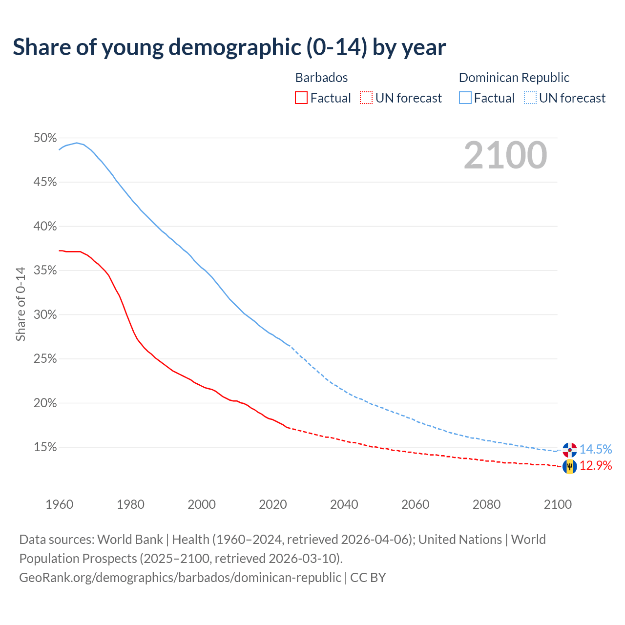 - The share of young demographic (0-15 years old) in Barbados is 17.2% vs 26.6% in the Dominican Republic.