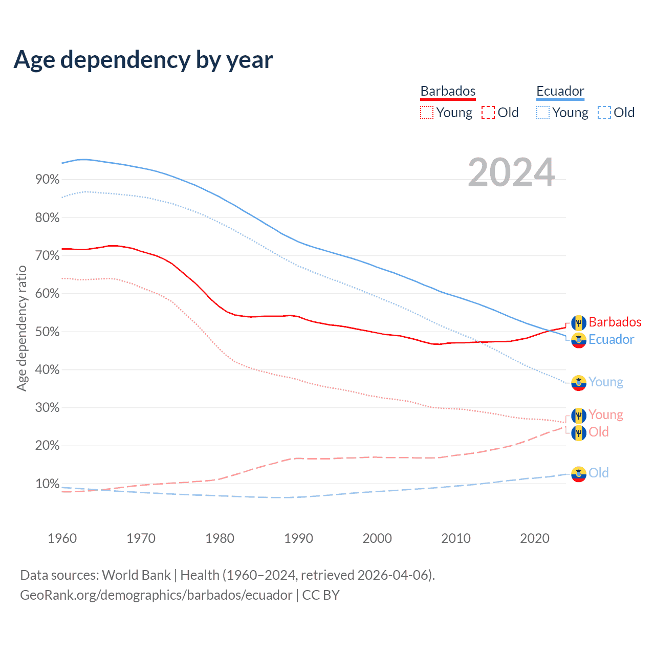 - Barbados is ranked 47/196 by median age (oldest to youngest) vs 105/196 for Ecuador.