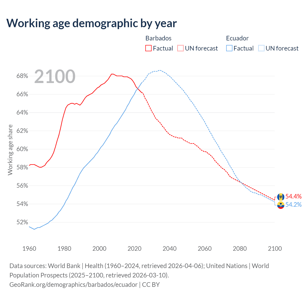 Median age Barbados vs Ecuador, 1960-2100