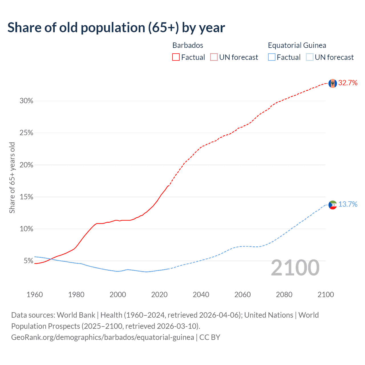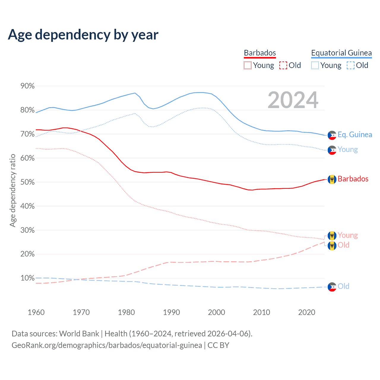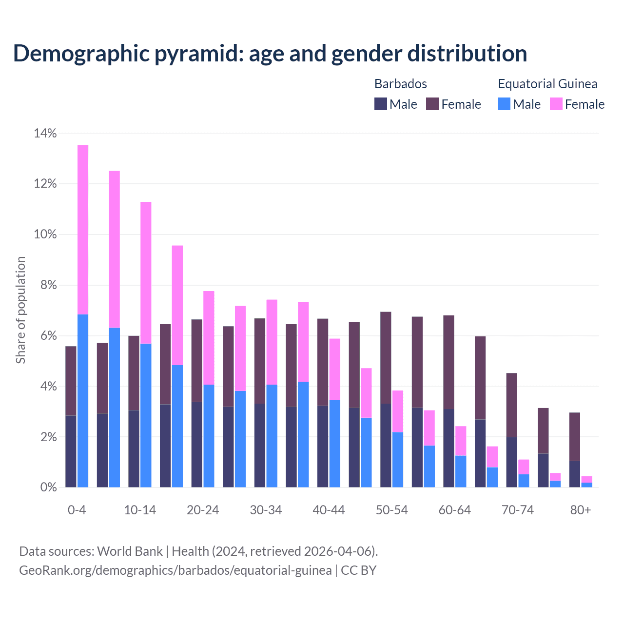 - The share of old-age demographic (65+) in Barbados is 16.6% vs 3.69% in Equatorial Guinea.