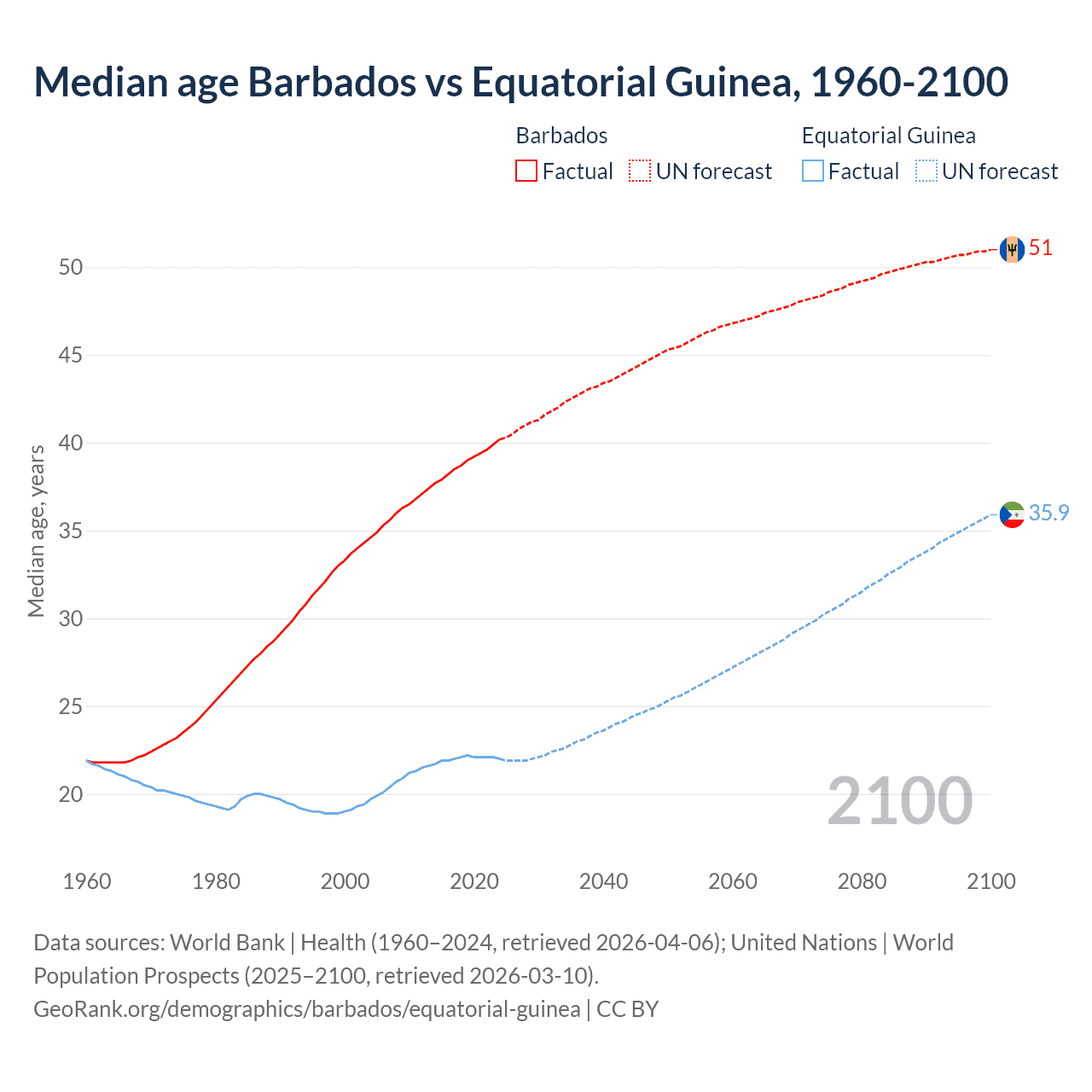 Median age Barbados vs Equatorial Guinea, 1960-2100