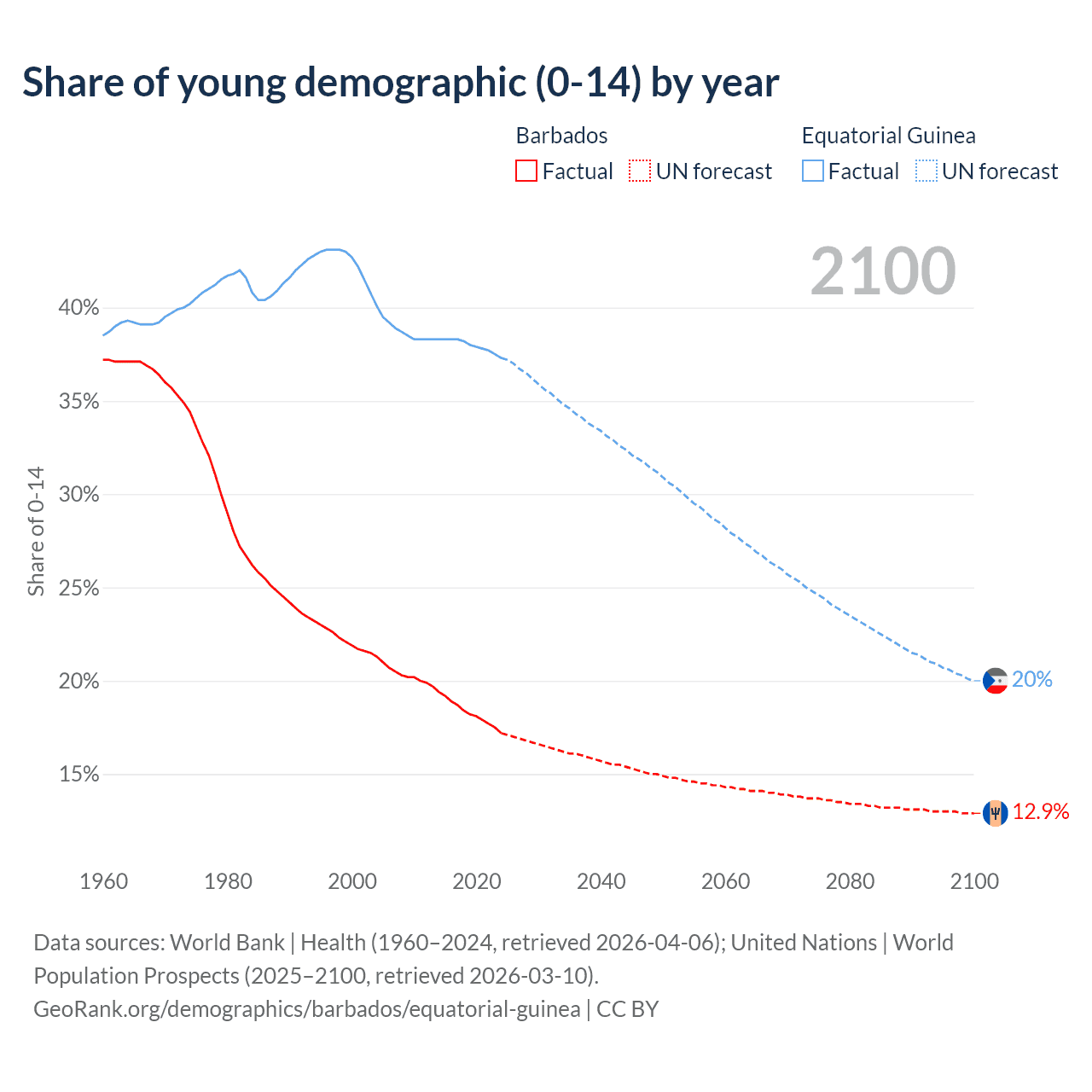 - The share of young demographic (0-15 years old) in Barbados is 17.2% vs 37.3% in Equatorial Guinea.