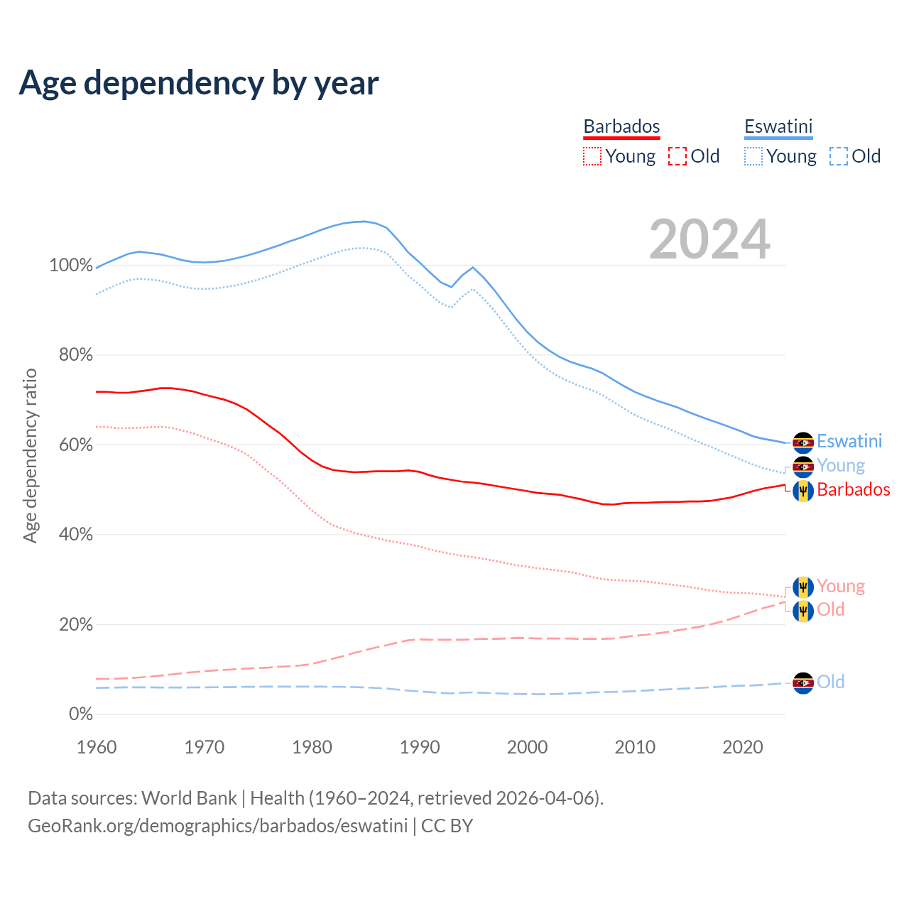 - The share of old-age demographic (65+) in Barbados is 16.6% vs 4.26% in Eswatini.