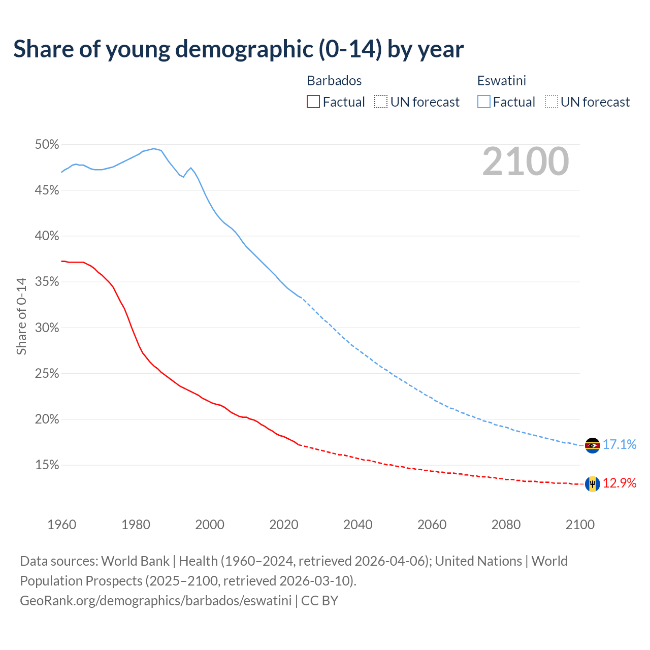 - The share of young demographic (0-15 years old) in Barbados is 17.2% vs 33.4% in Eswatini.