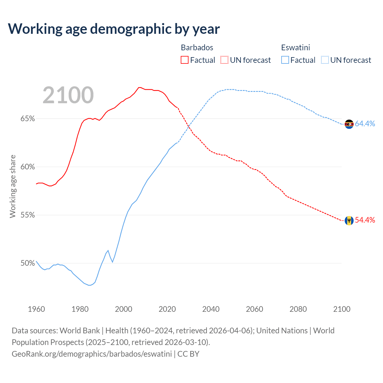 - Barbados has 187K working age adults (aged 15-64) vs 794K in Eswatini.