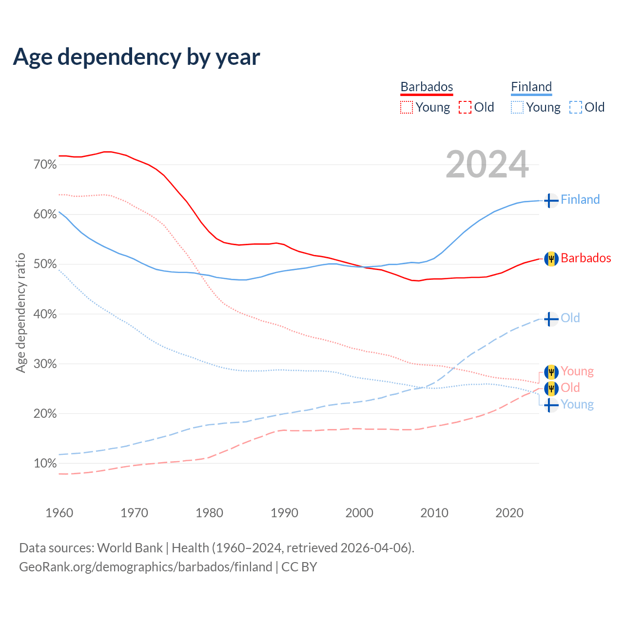 - Barbados is ranked 47/196 by median age (oldest to youngest) vs 22/196 for Finland.