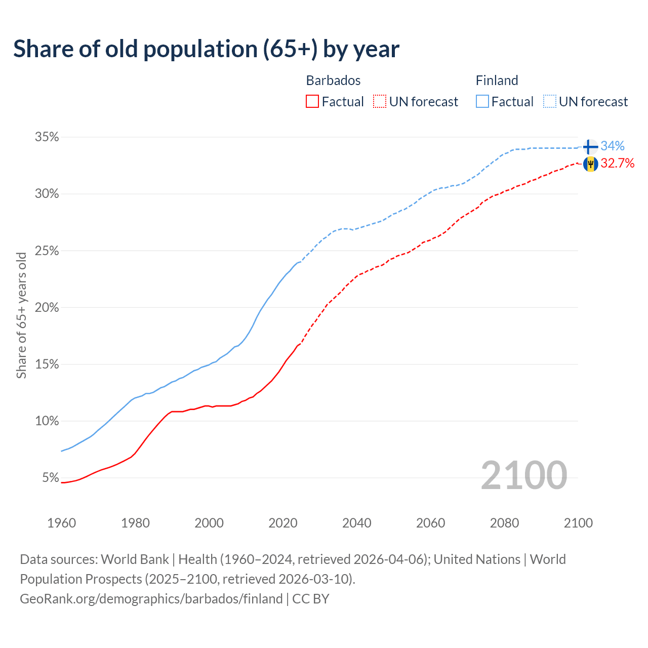 The share of older people aged 65 and over is 16.6% in Barbados and 23.9% in Finland. Life expectancy in Barbados compared to Finland .