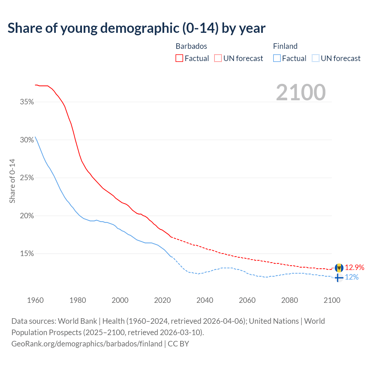 - The share of young demographic (0-15 years old) in Barbados is 17.2% vs 14.6% in Finland.