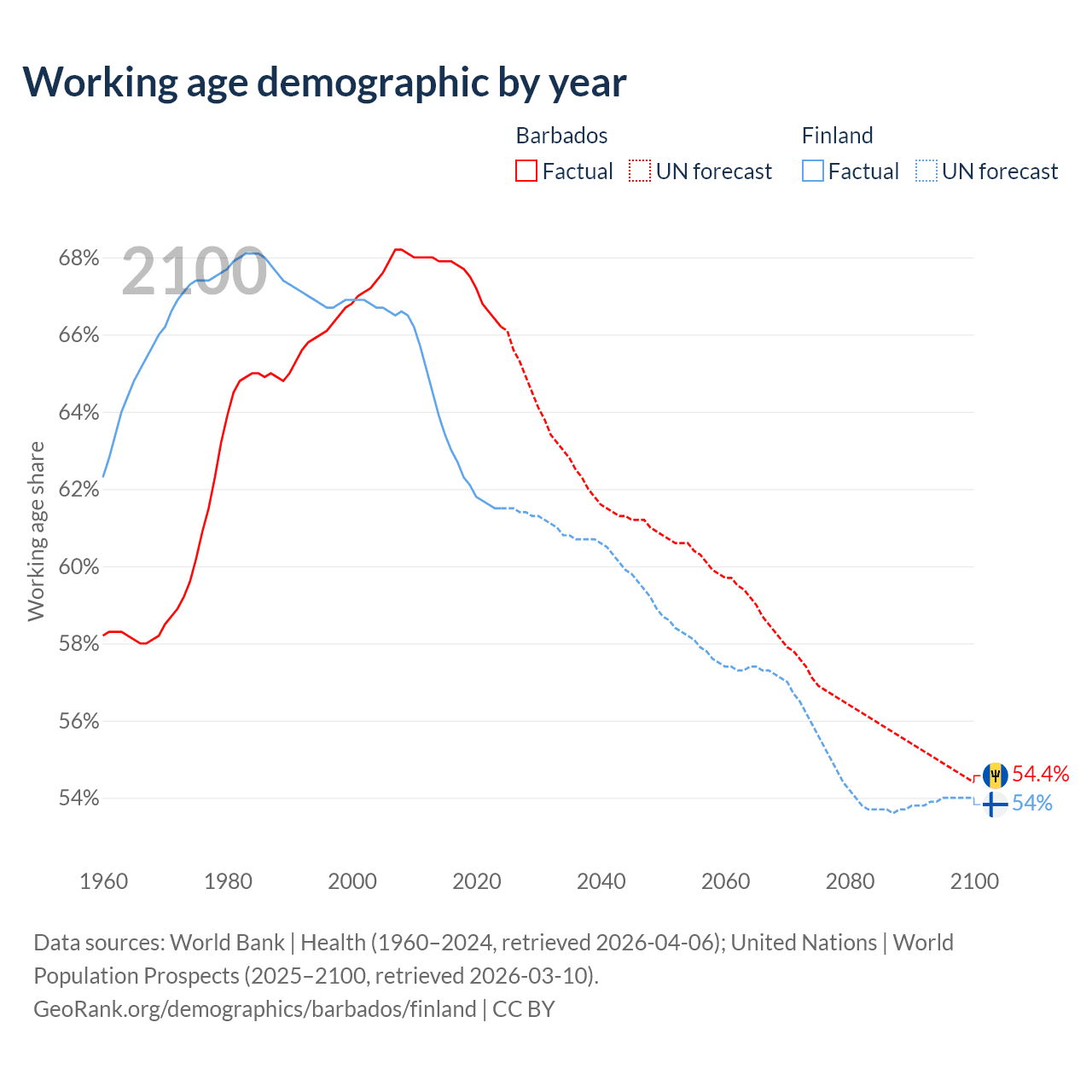 Median age Barbados vs Finland, 1960-2100