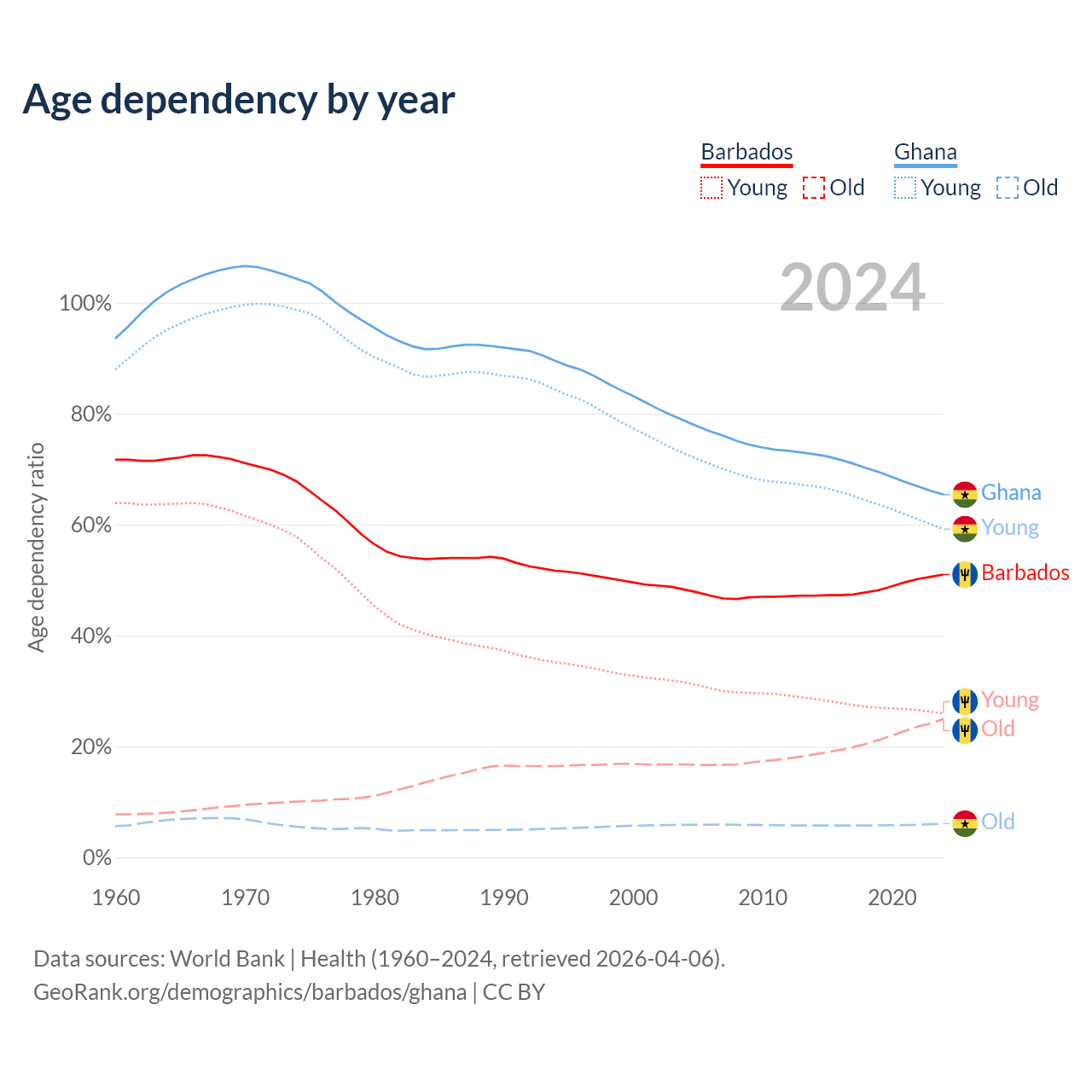 - Barbados is ranked 47/196 by median age (oldest to youngest) vs 146/196 for Ghana.
