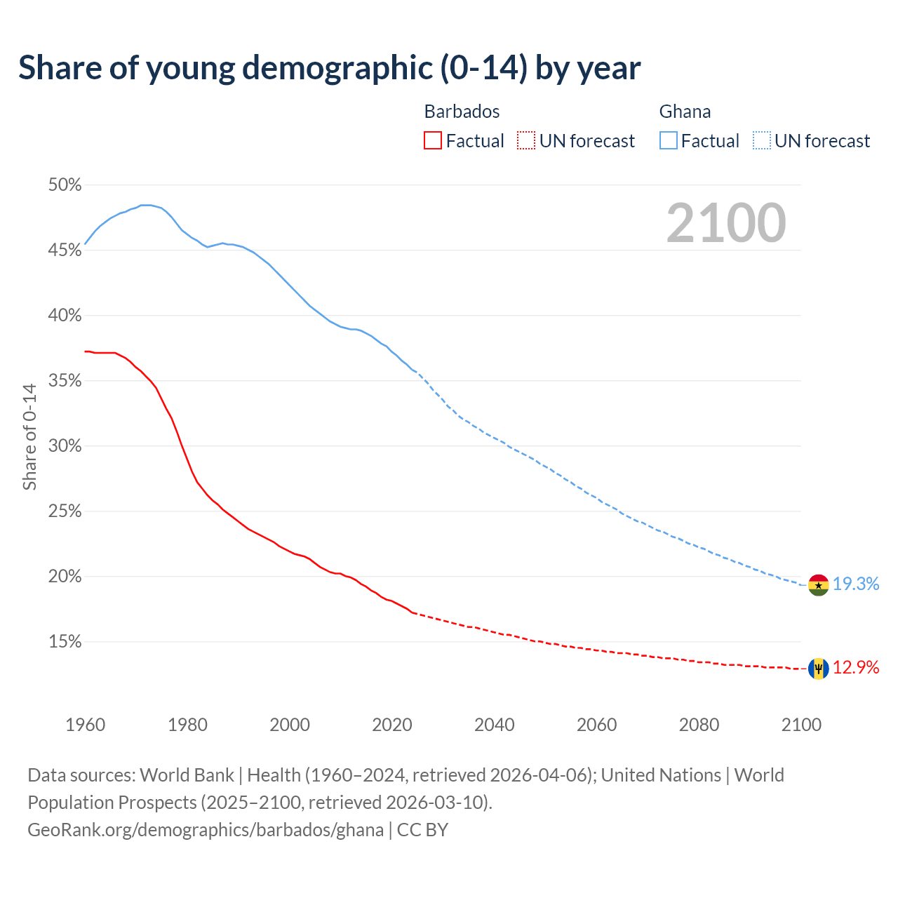 - The share of young demographic (0-15 years old) in Barbados is 17.2% vs 35.8% in Ghana.