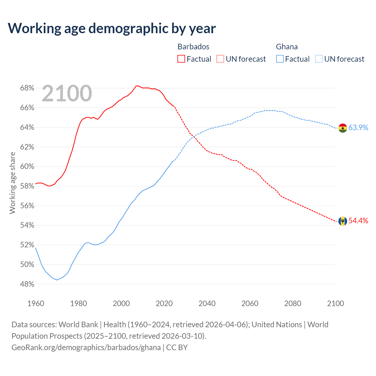 - Barbados has 187K working age adults (aged 15-64) vs 21.7M in Ghana.