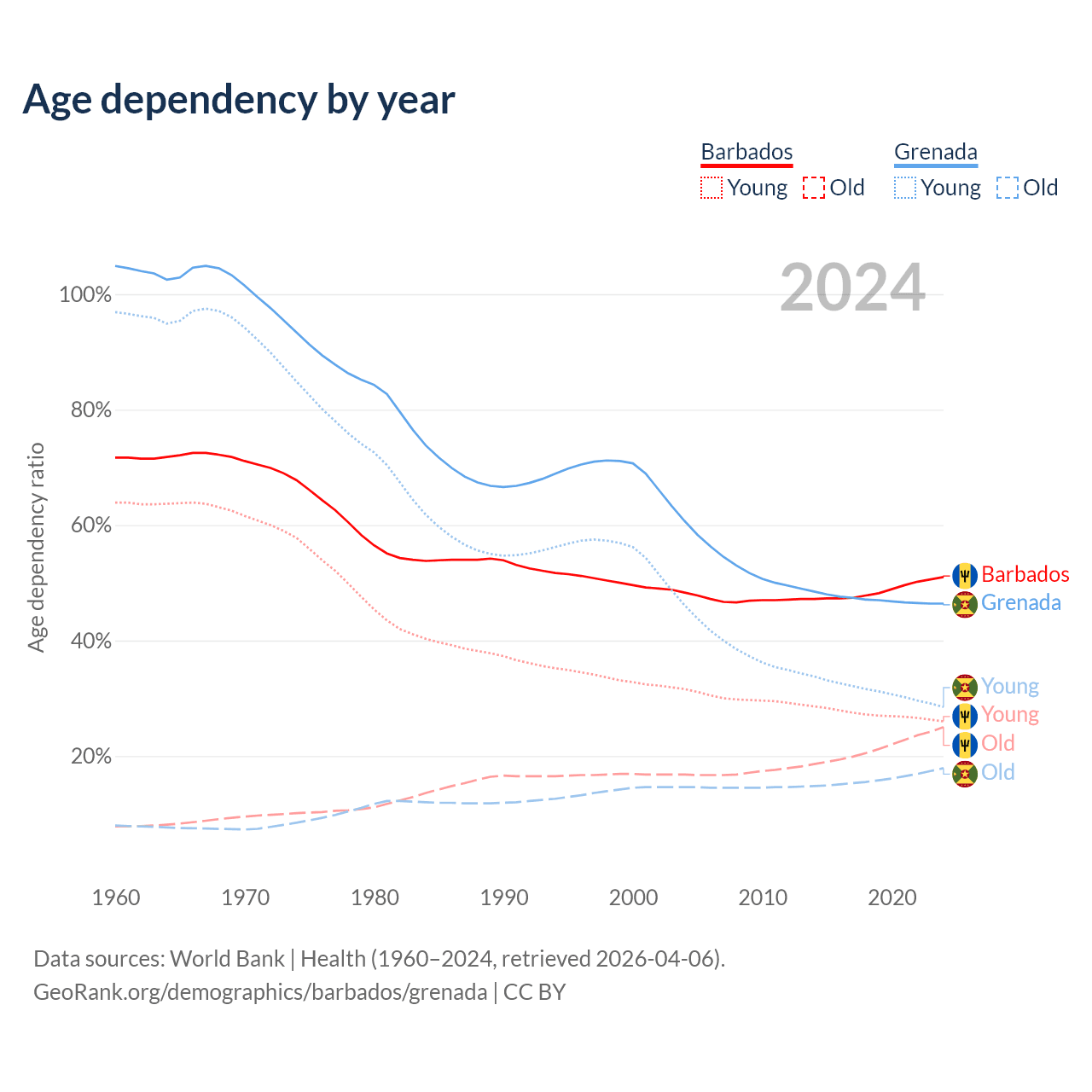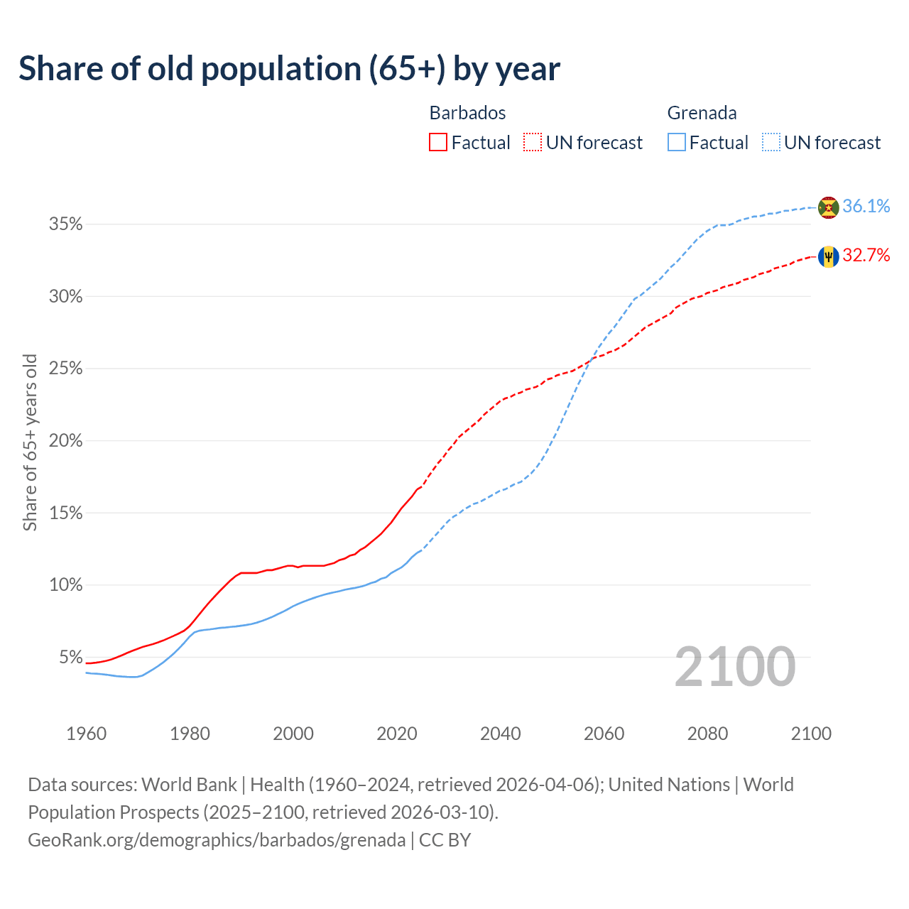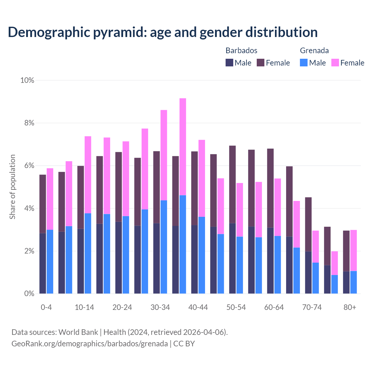 - Barbados is ranked 47/196 by median age (oldest to youngest) vs 77/196 for Grenada.