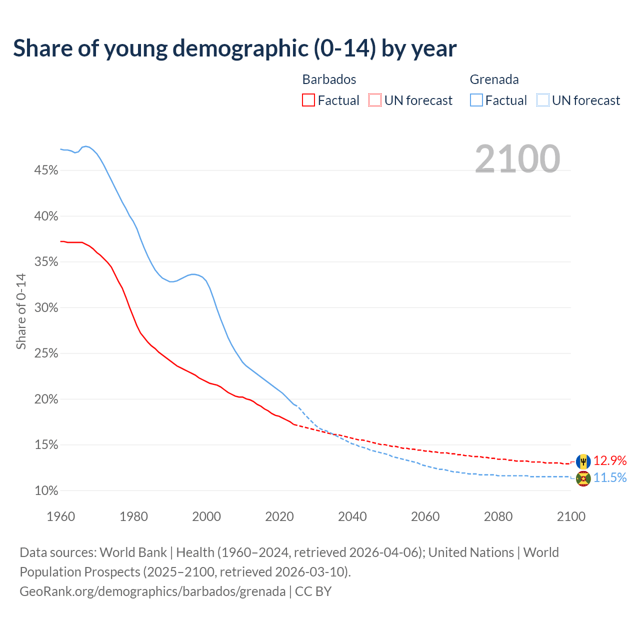 - The share of young demographic (0-15 years old) in Barbados is 17.2% vs 19.4% in Grenada.