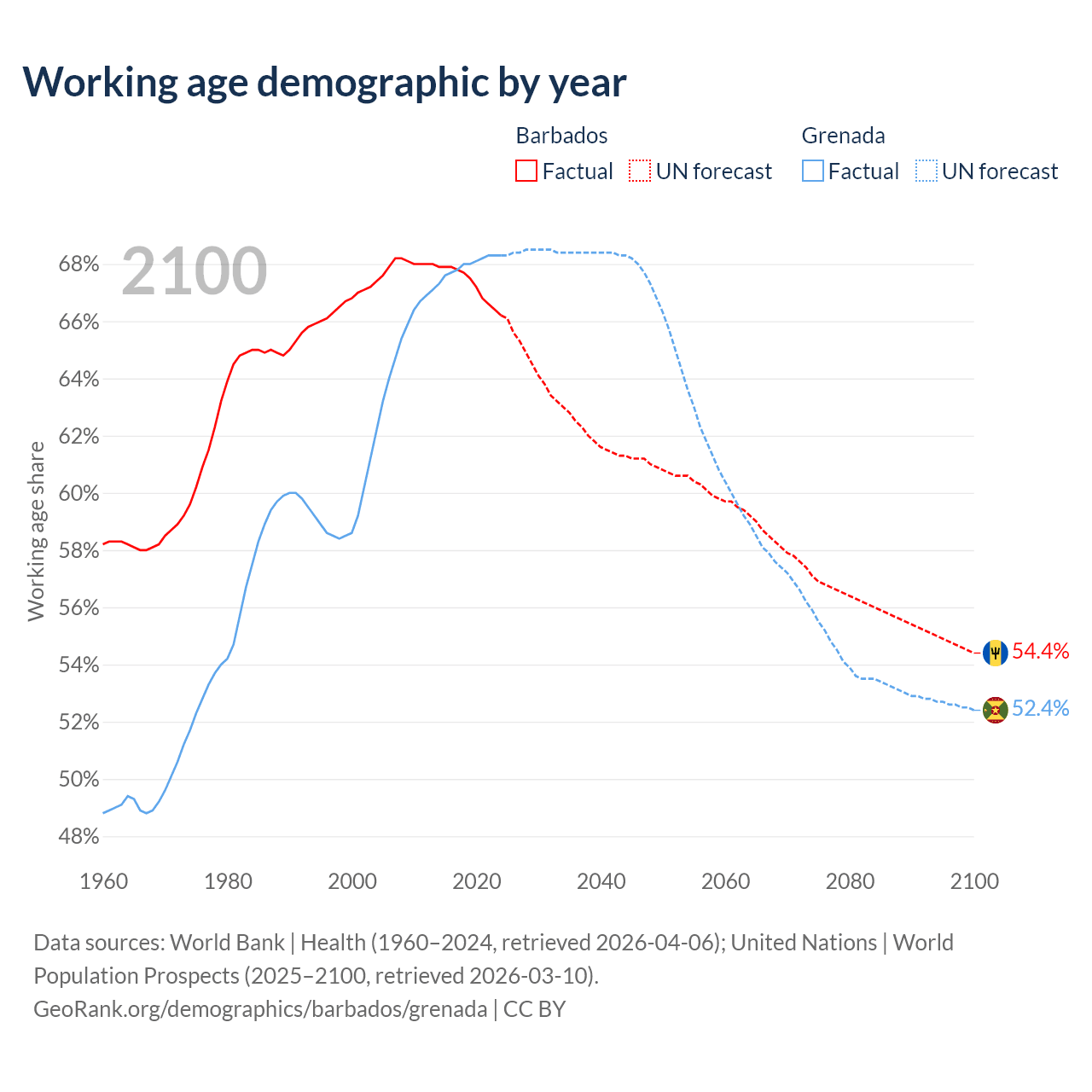 - Barbados has 187K working age adults (aged 15-64) vs 80.2K in Grenada.