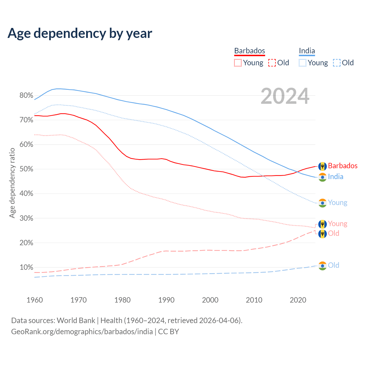 - Barbados is ranked 47/196 by median age (oldest to youngest) vs 108/196 for India.