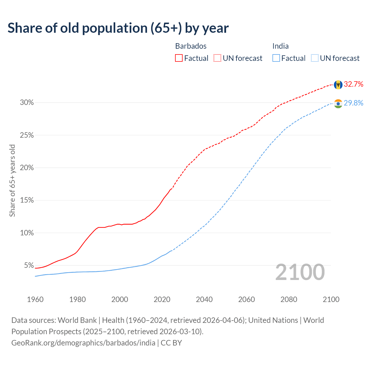The share of older people aged 65 and over is 16.6% in Barbados and 7.15% in India. Life expectancy in Barbados compared to India .