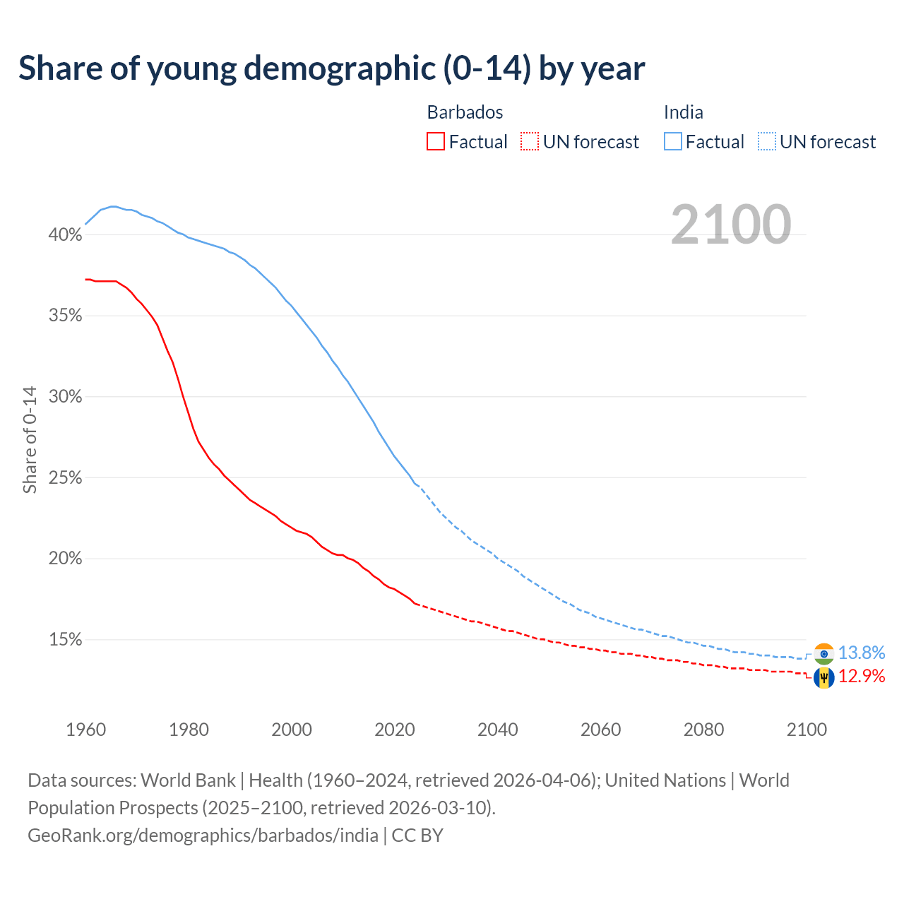 - The share of young demographic (0-15 years old) in Barbados is 17.2% vs 24.6% in India.