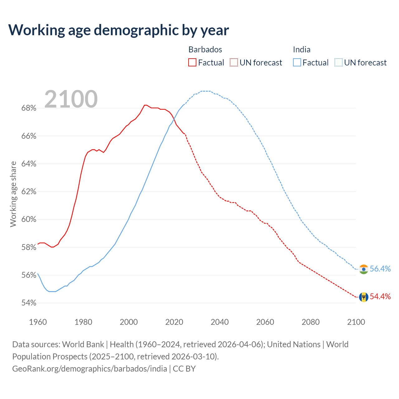 Median age Barbados vs India, 1960-2100
