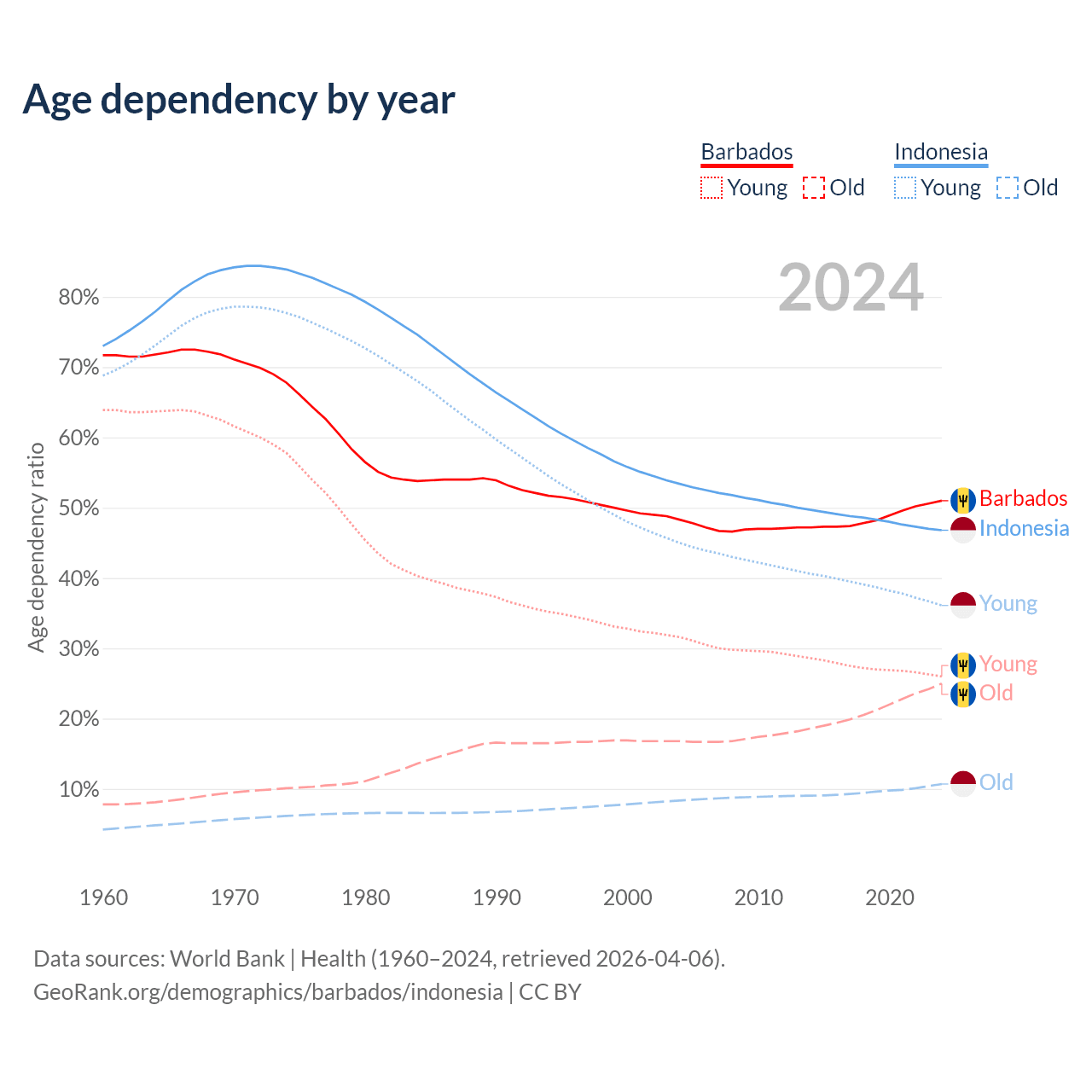- Barbados is ranked 47/196 by median age (oldest to youngest) vs 93/196 for Indonesia.