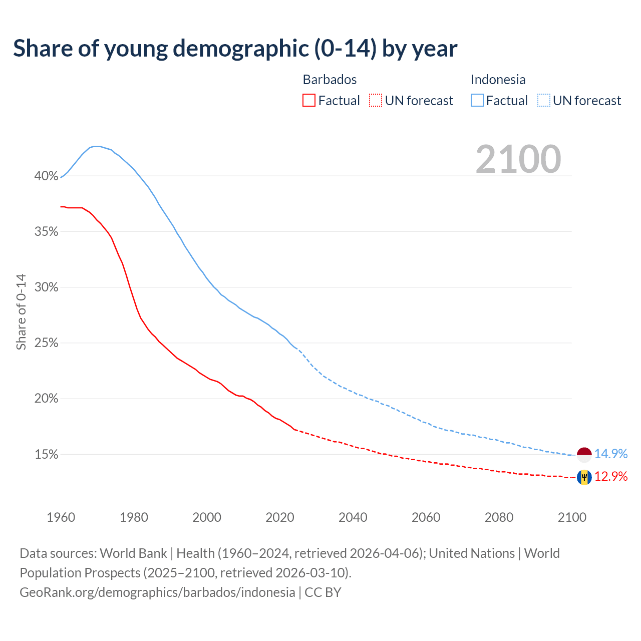 - The share of young demographic (0-15 years old) in Barbados is 17.2% vs 24.6% in Indonesia.