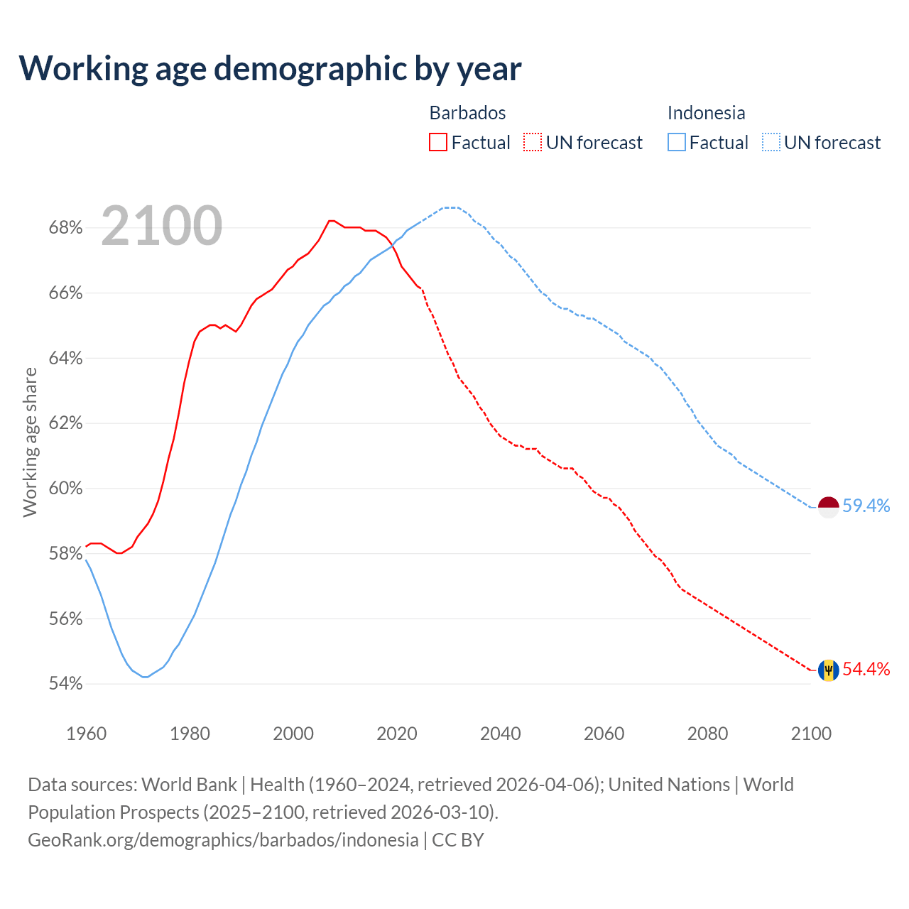 Median age Barbados vs Indonesia, 1960-2100