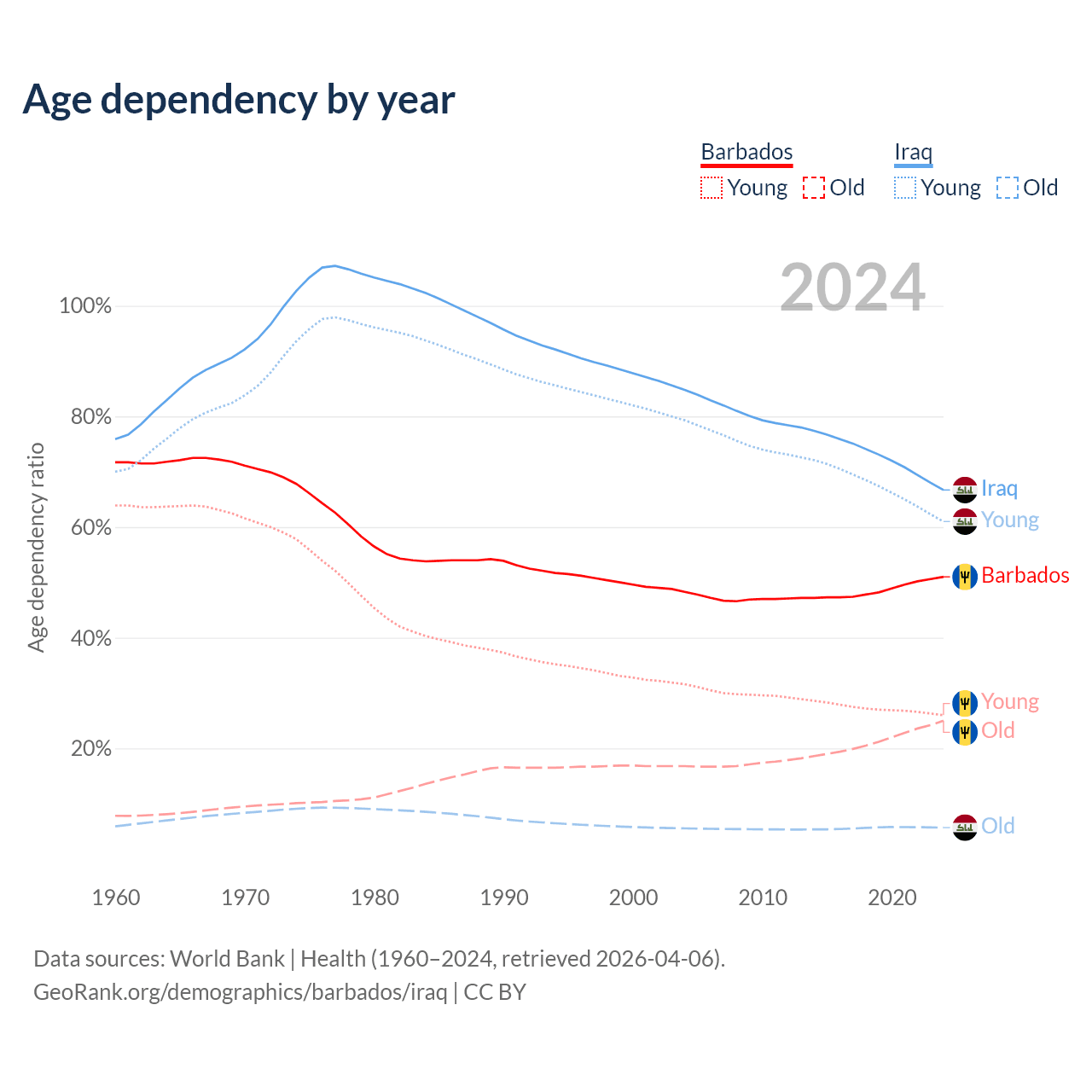 - Barbados is ranked 47/196 by median age (oldest to youngest) vs 151/196 for Iraq.