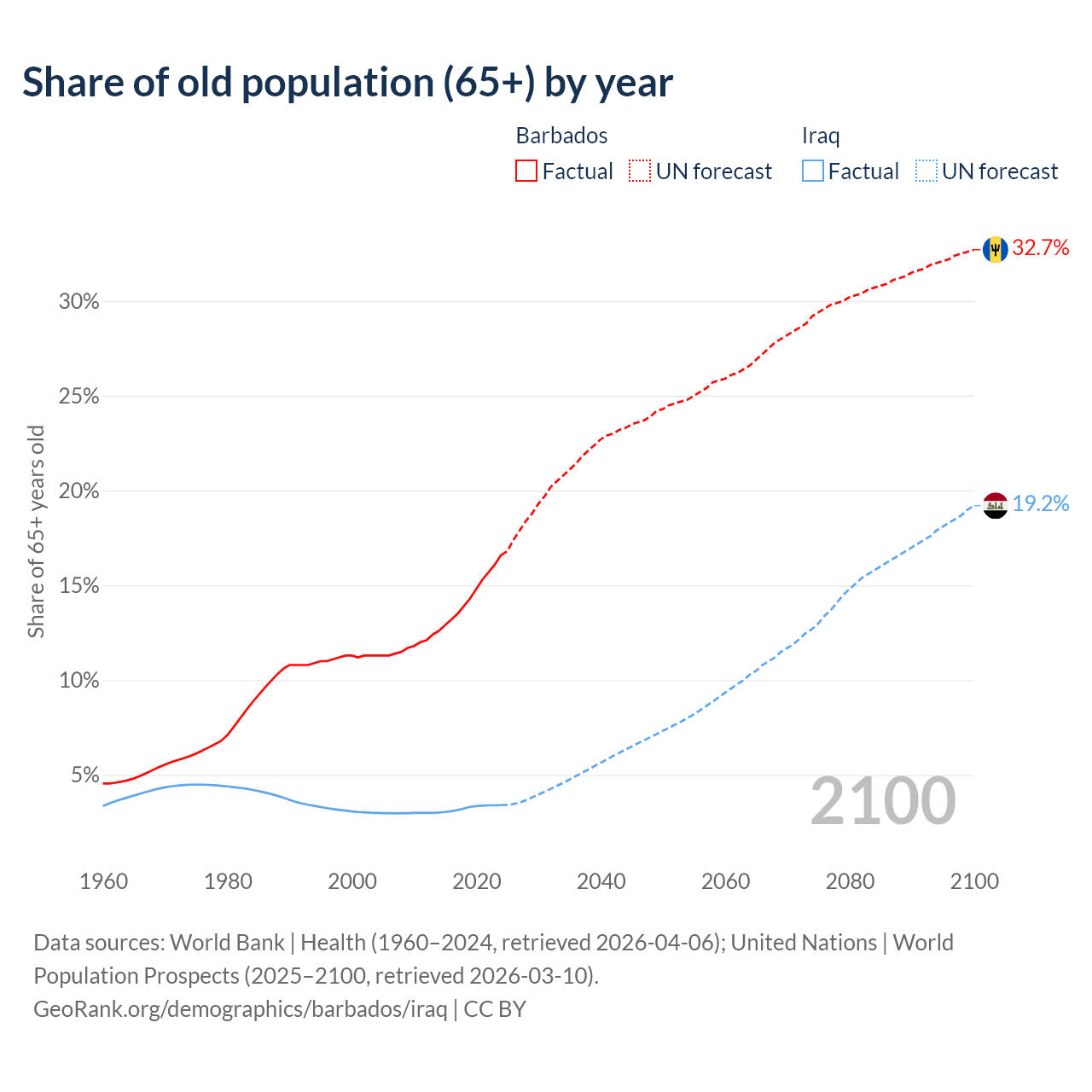 The share of older people aged 65 and over is 16.6% in Barbados and 3.41% in Iraq. Life expectancy in Barbados compared to Iraq .