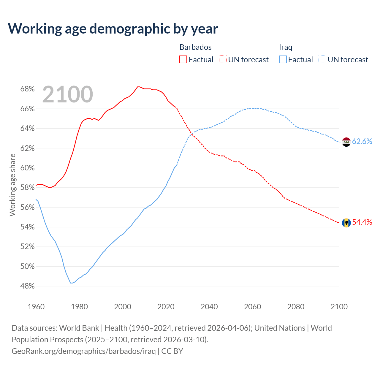 Median age Barbados vs Iraq, 1960-2100