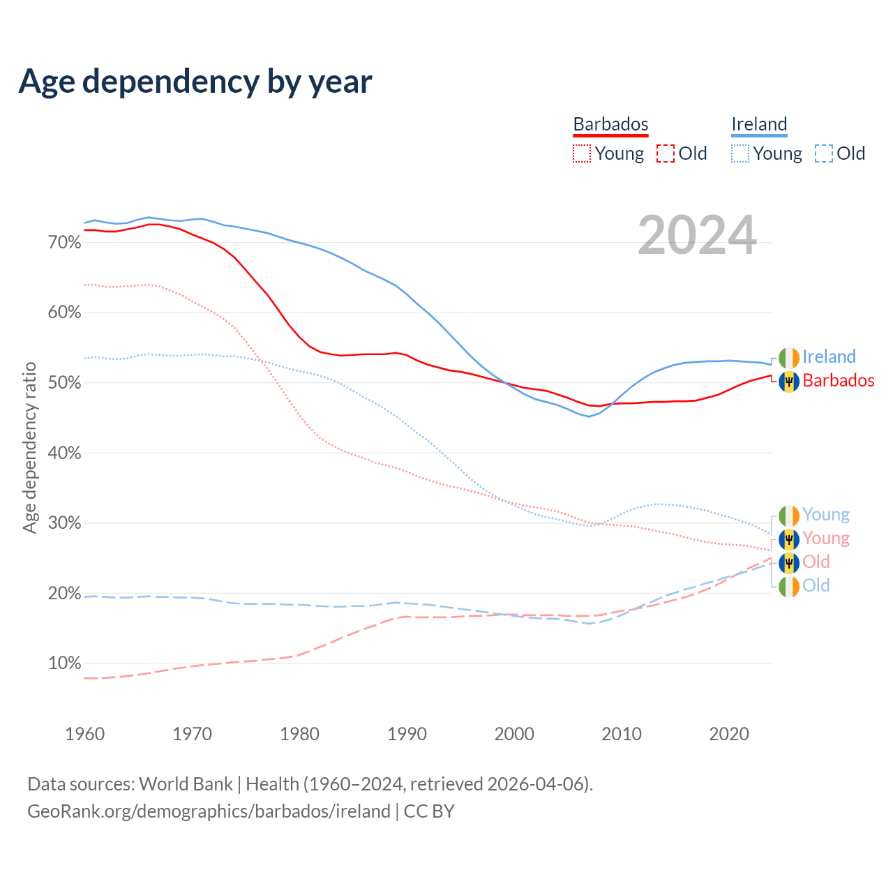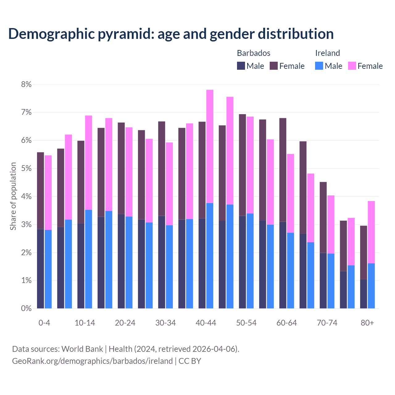 - Barbados is ranked 47/196 by median age (oldest to youngest) vs 48/196 for Ireland.