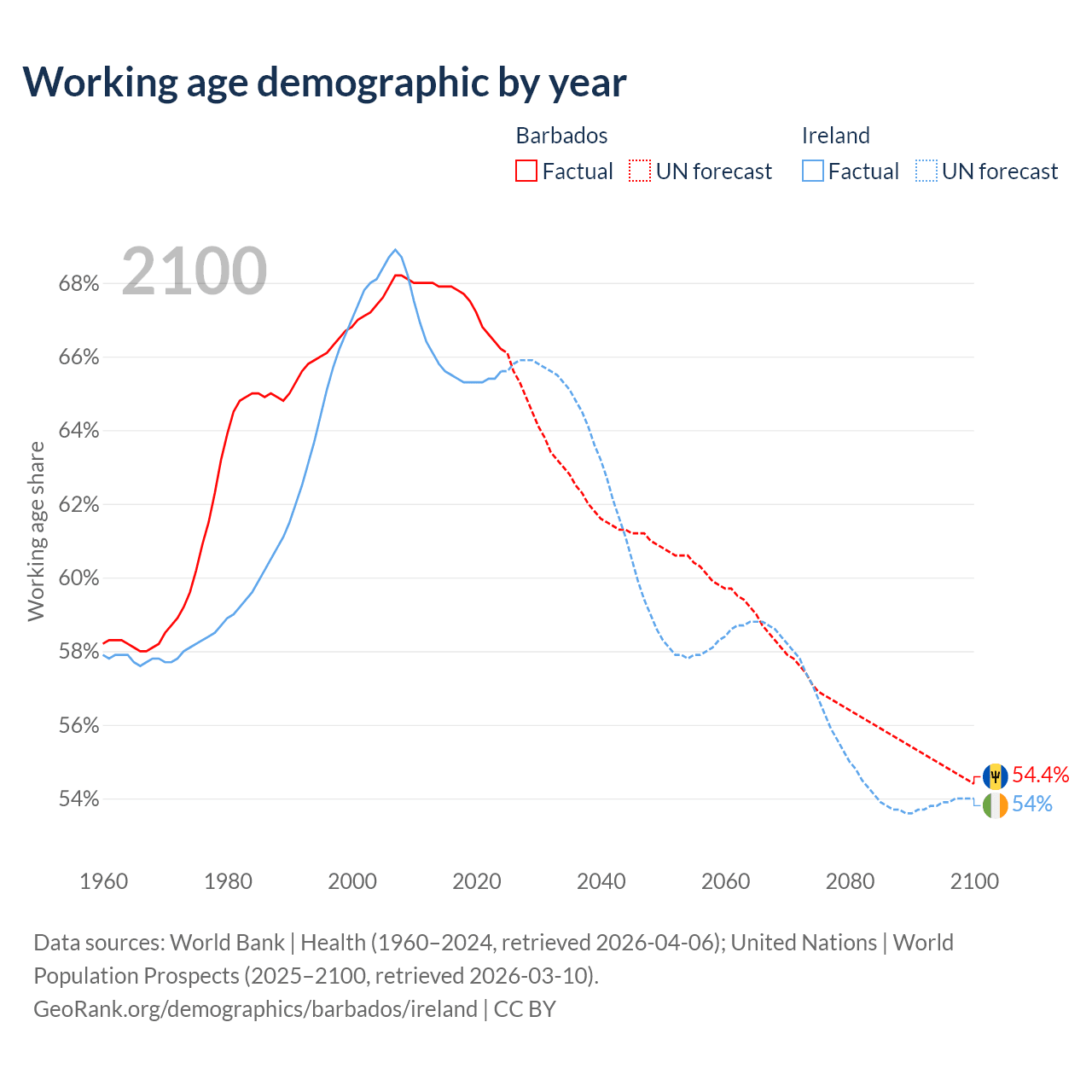 - Barbados has 187K working age adults (aged 15-64) vs 3.62M in Ireland.