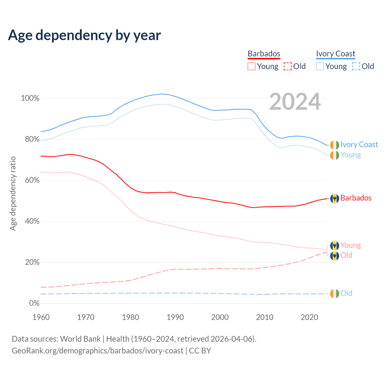 - Barbados is ranked 47/196 by median age (oldest to youngest) vs 175/196 for Ivory Coast.