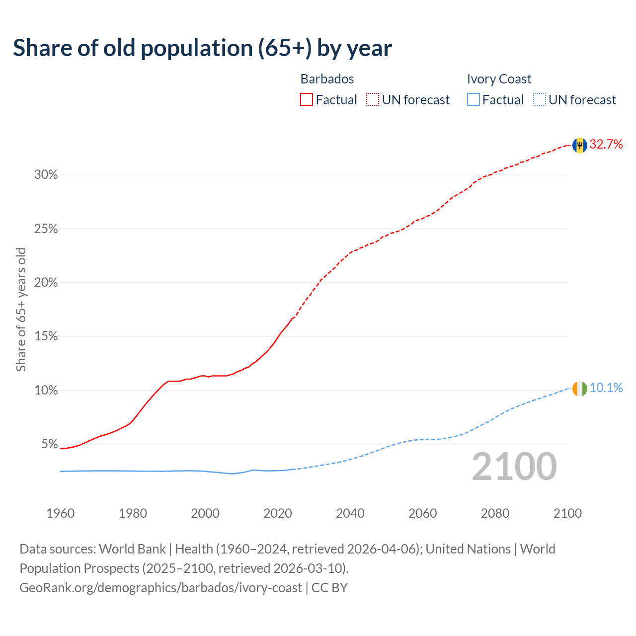 - The share of old-age demographic (65+) in Barbados is 16.6% vs 2.61% in Ivory Coast.