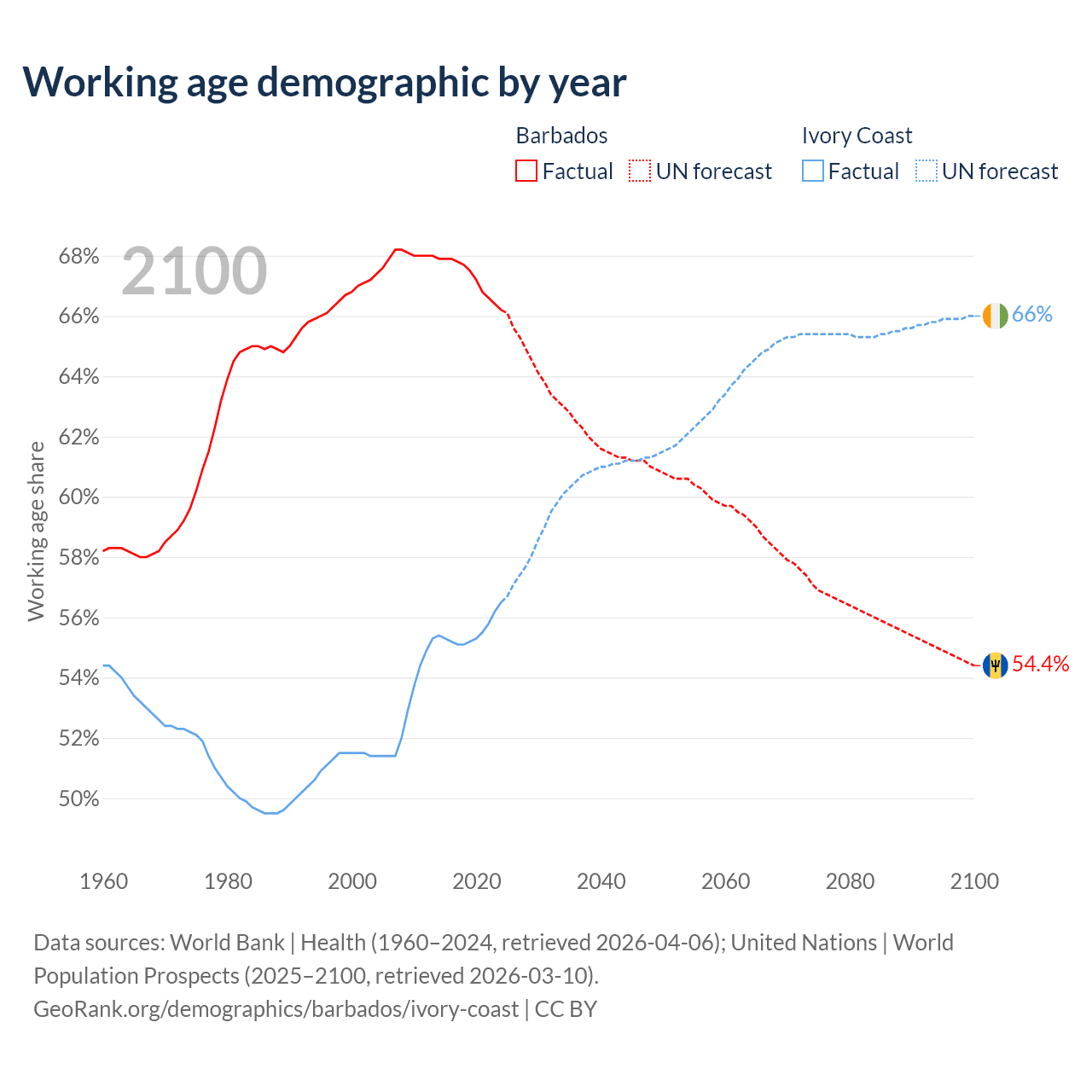 - Barbados has 187K working age adults (aged 15-64) vs 19.1M in Ivory Coast.