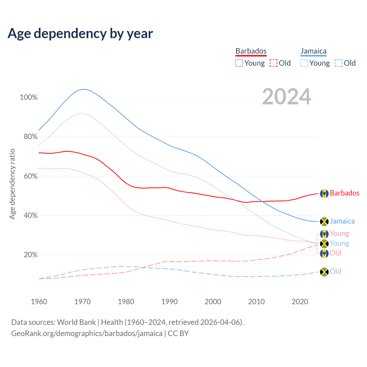 - Barbados is ranked 47/196 by median age (oldest to youngest) vs 87/196 for Jamaica.