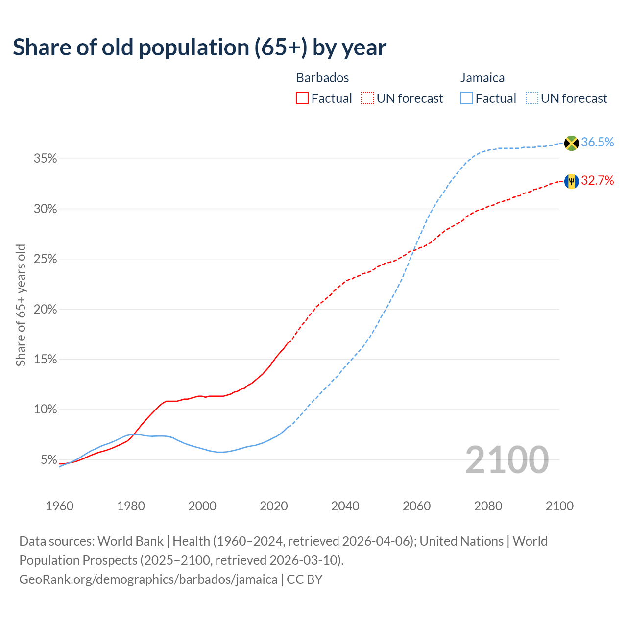 The share of older people aged 65 and over is 16.6% in Barbados and 8.21% in Jamaica. Life expectancy in Barbados compared to Jamaica .