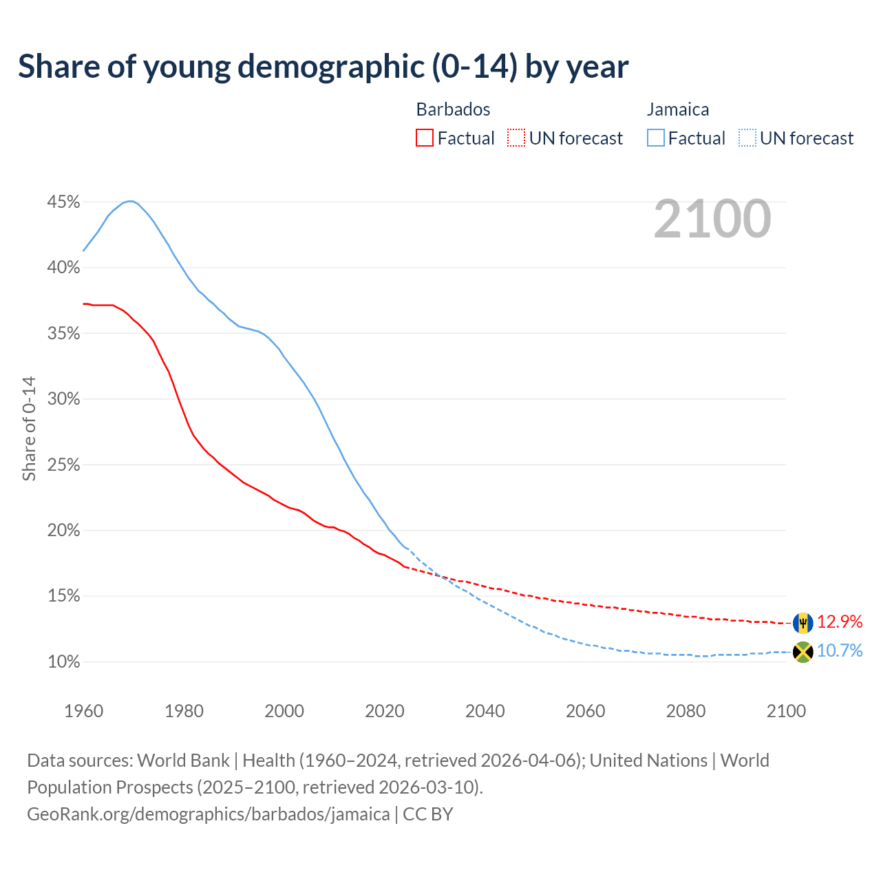 - As of 2026, the population of Barbados is 283K vs 2.83M in Jamaica - 10 times difference.