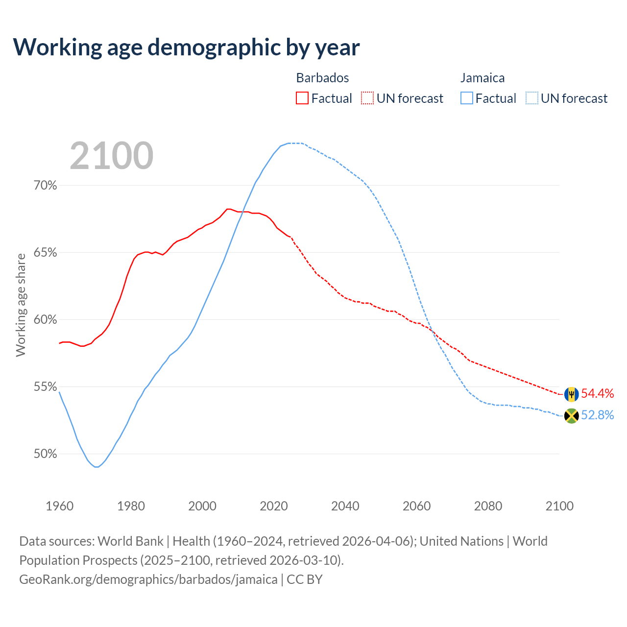 - Barbados has 187K working age adults (aged 15-64) vs 2.07M in Jamaica.