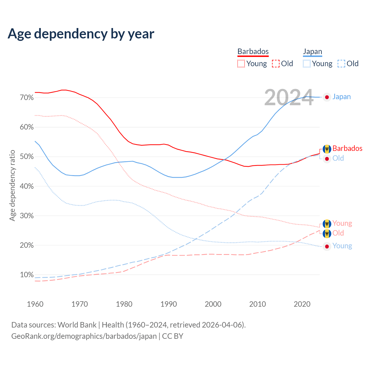 - Barbados is ranked 47/196 by median age (oldest to youngest) vs 2/196 for Japan.