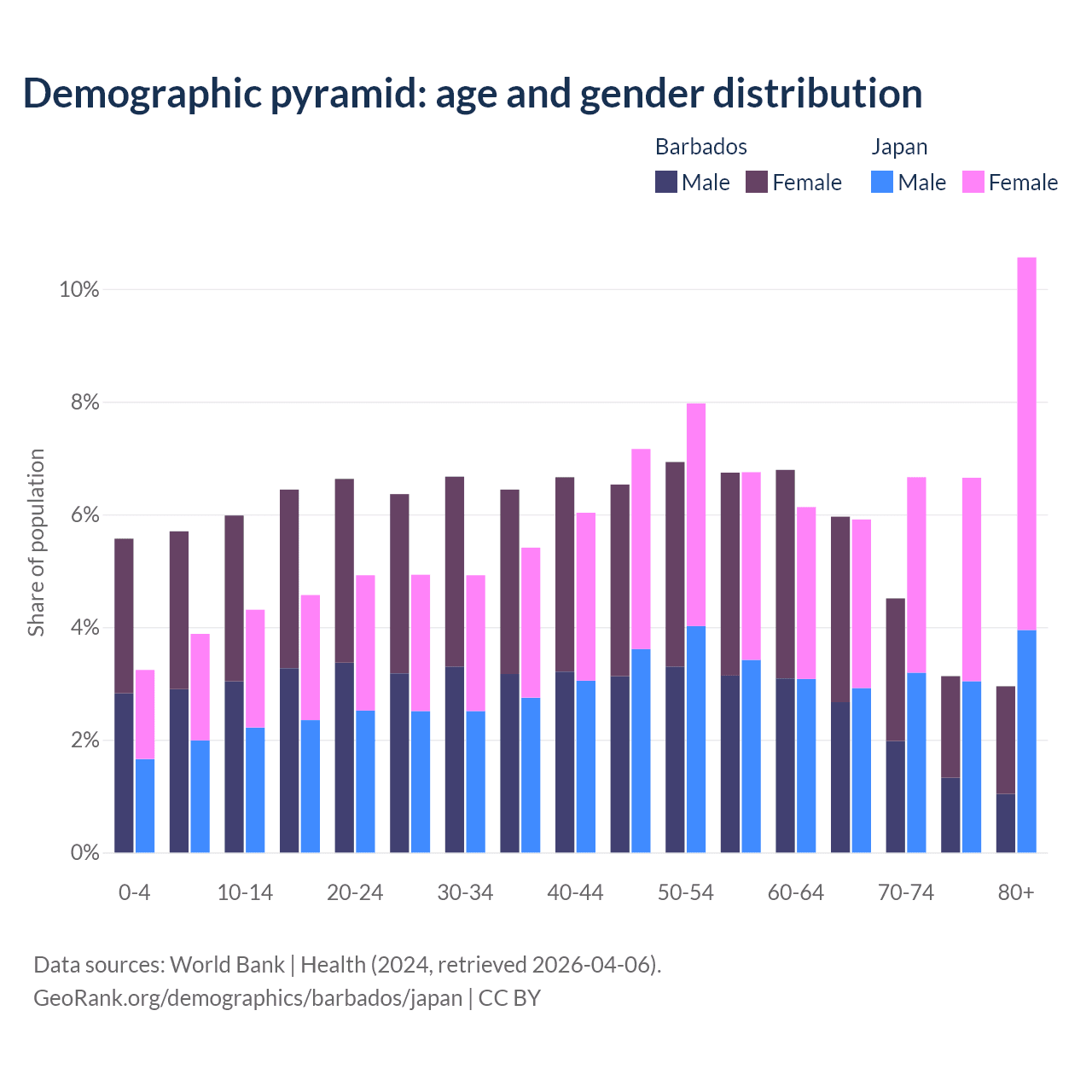 The share of older people aged 65 and over is 16.6% in Barbados and 29.8% in Japan. Life expectancy in Barbados compared to Japan .