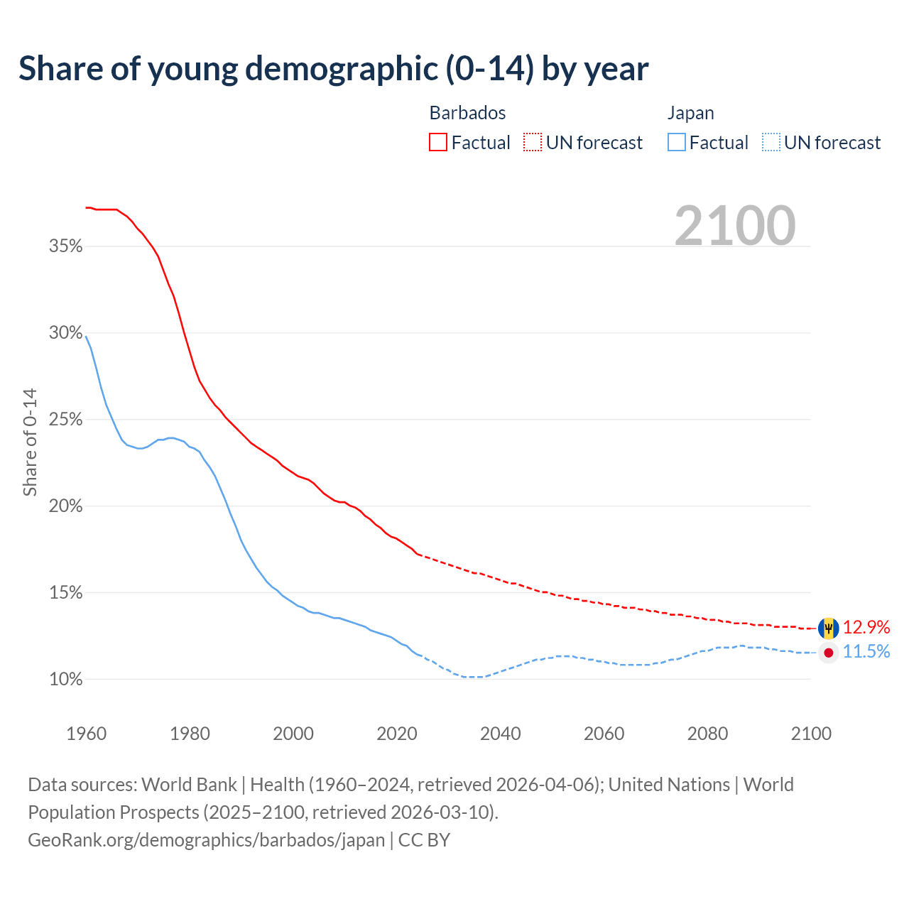 - The share of young demographic (0-15 years old) in Barbados is 17.2% vs 11.4% in Japan.