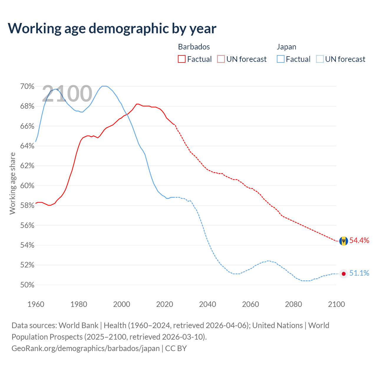 - Barbados has 187K working age adults (aged 15-64) vs 72.1M in Japan.