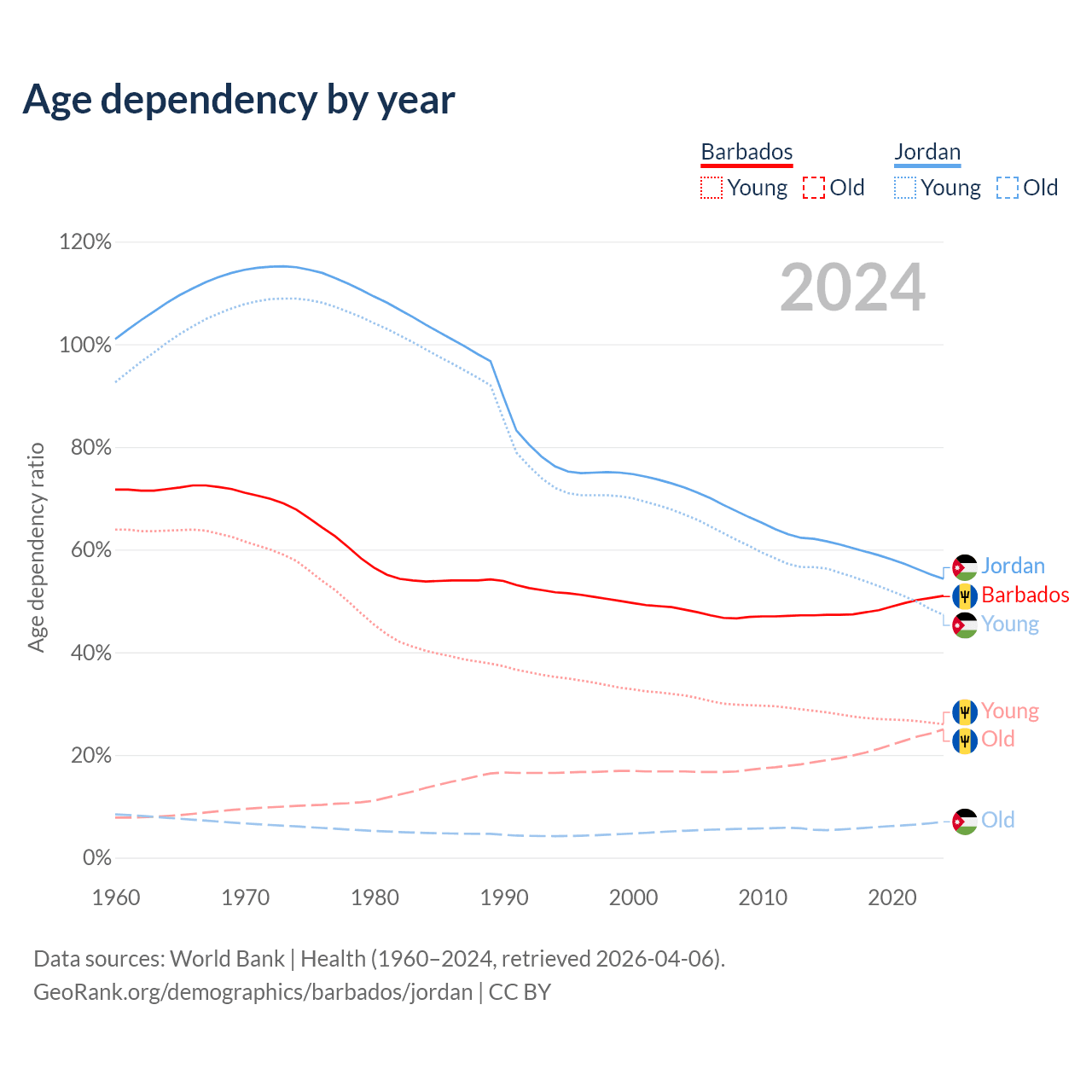 - Barbados is ranked 47/196 by median age (oldest to youngest) vs 131/196 for Jordan.