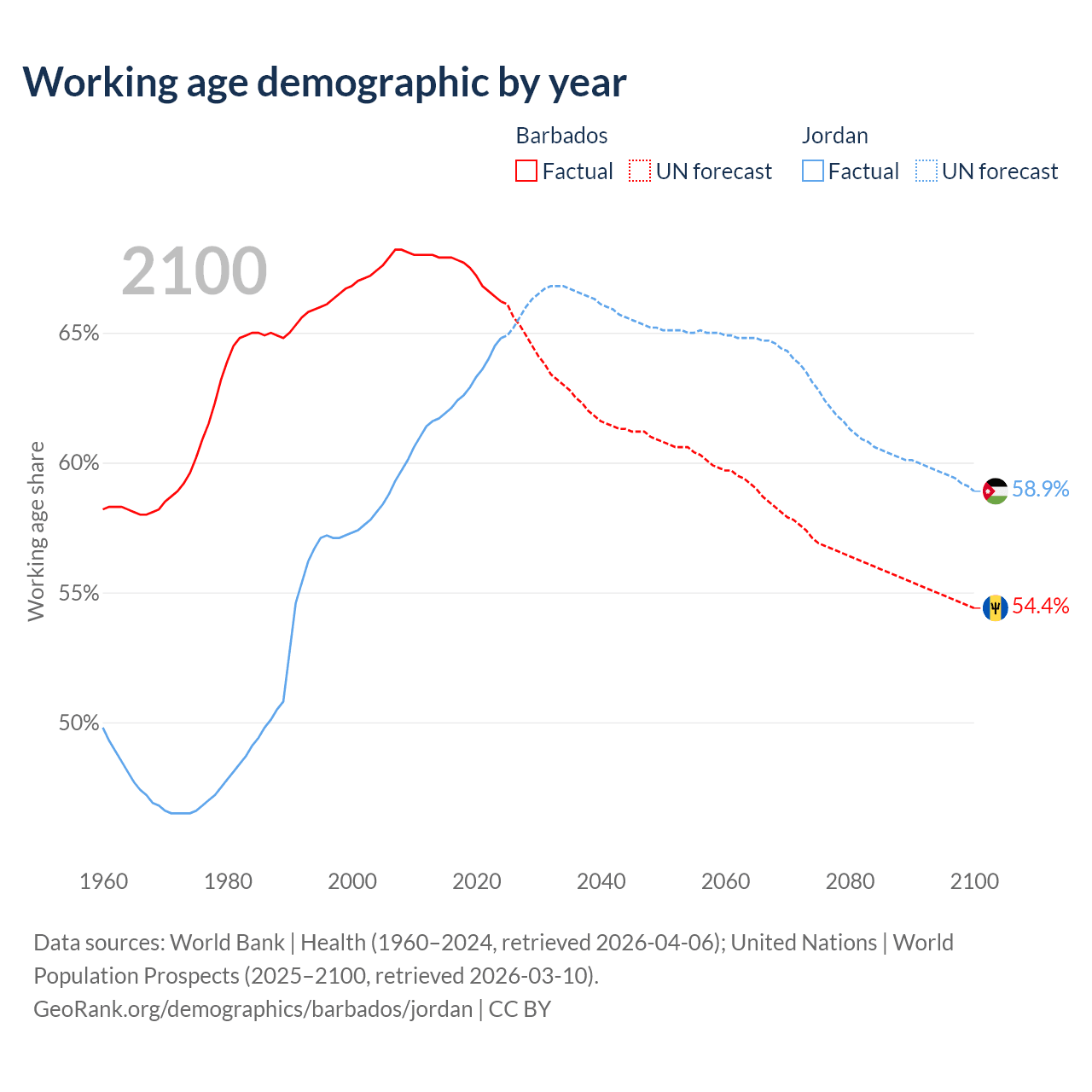 Median age Barbados vs Jordan, 1960-2100
