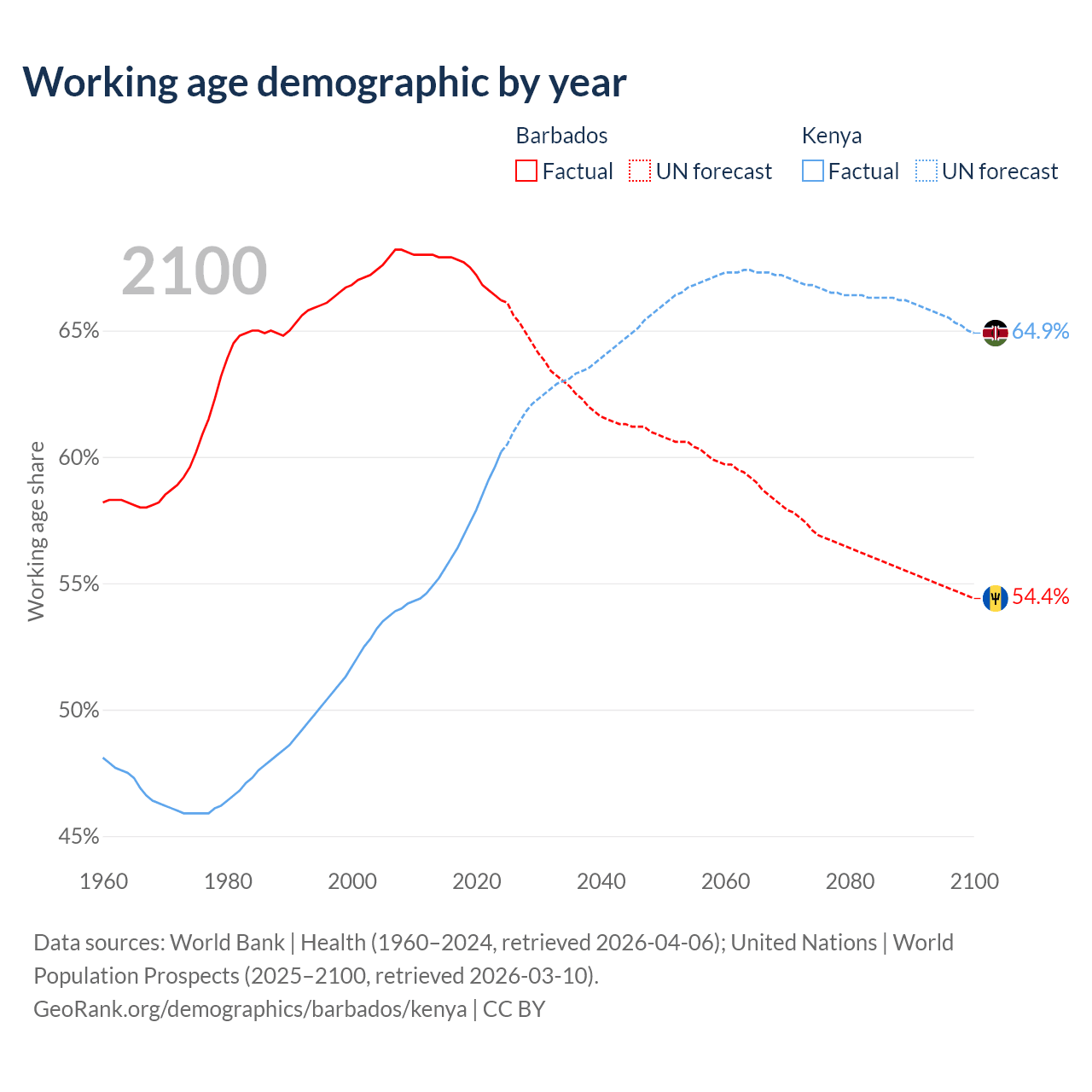 - Barbados has 187K working age adults (aged 15-64) vs 35.5M in Kenya.