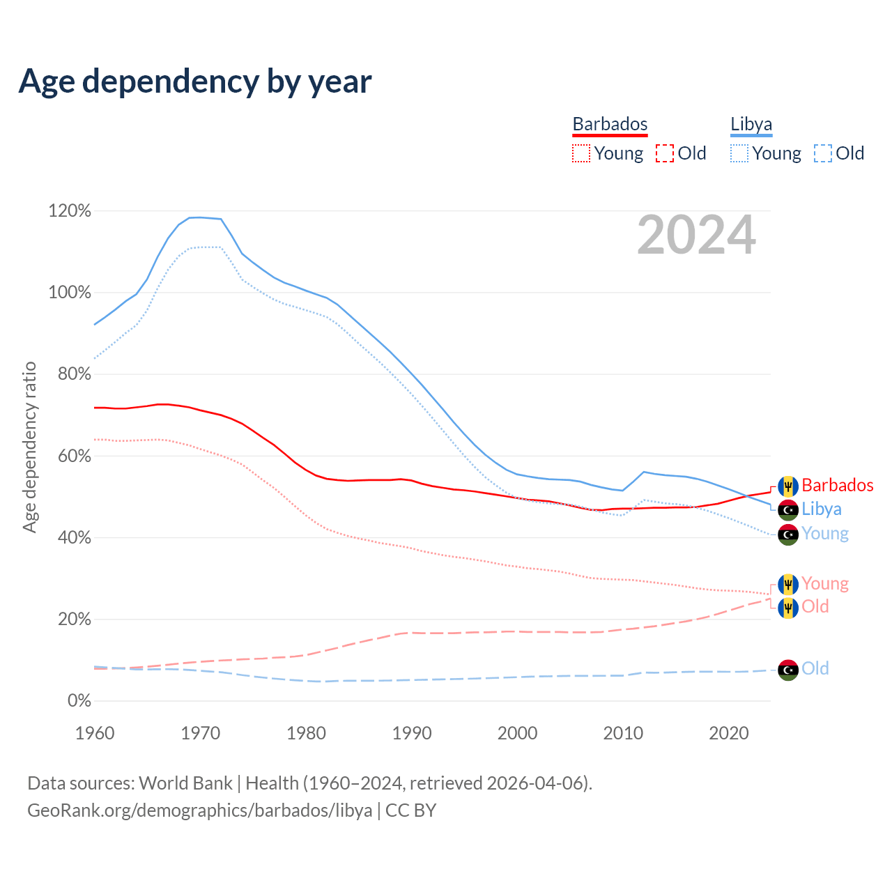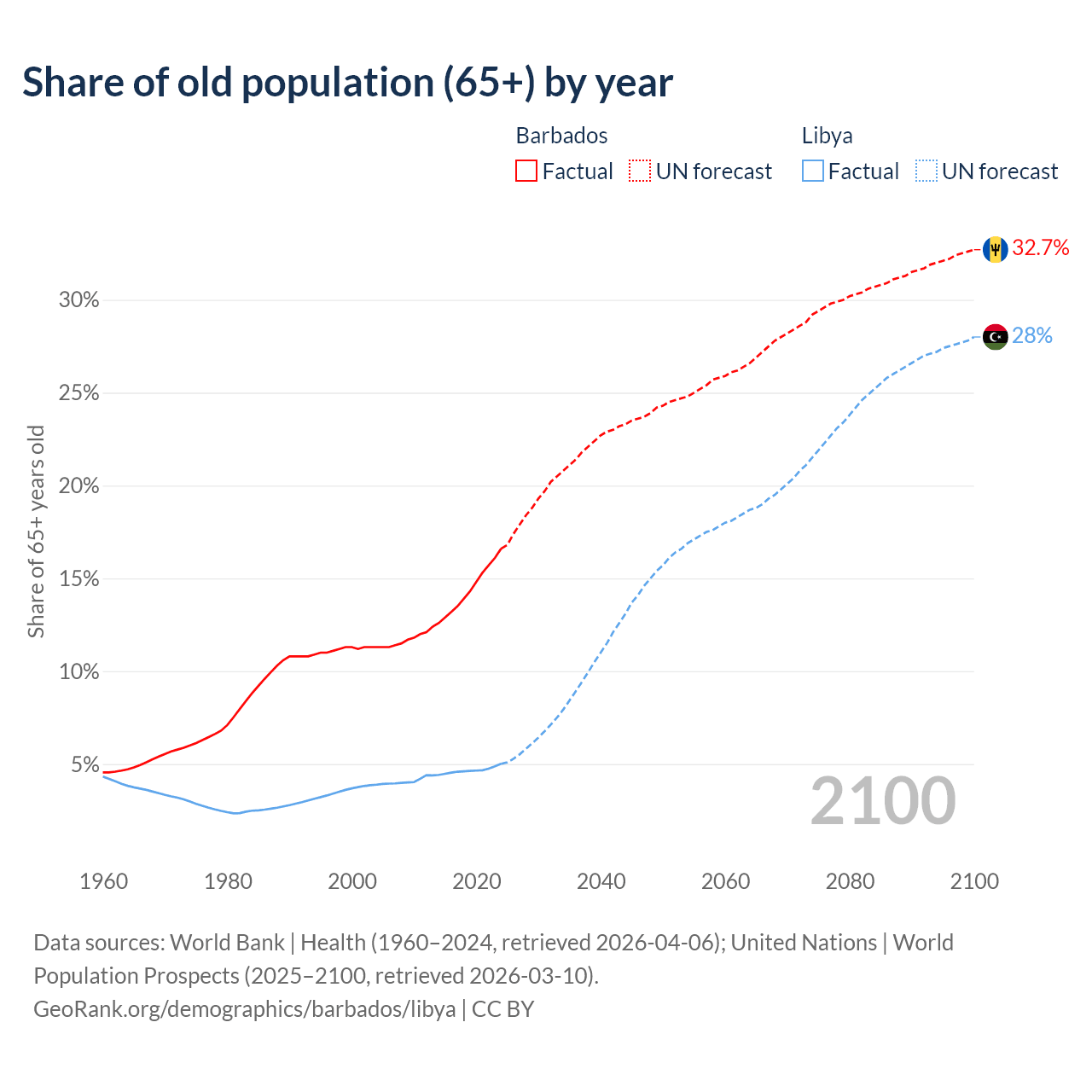 - The share of old-age demographic (65+) in Barbados is 16.6% vs 5.02% in Libya.