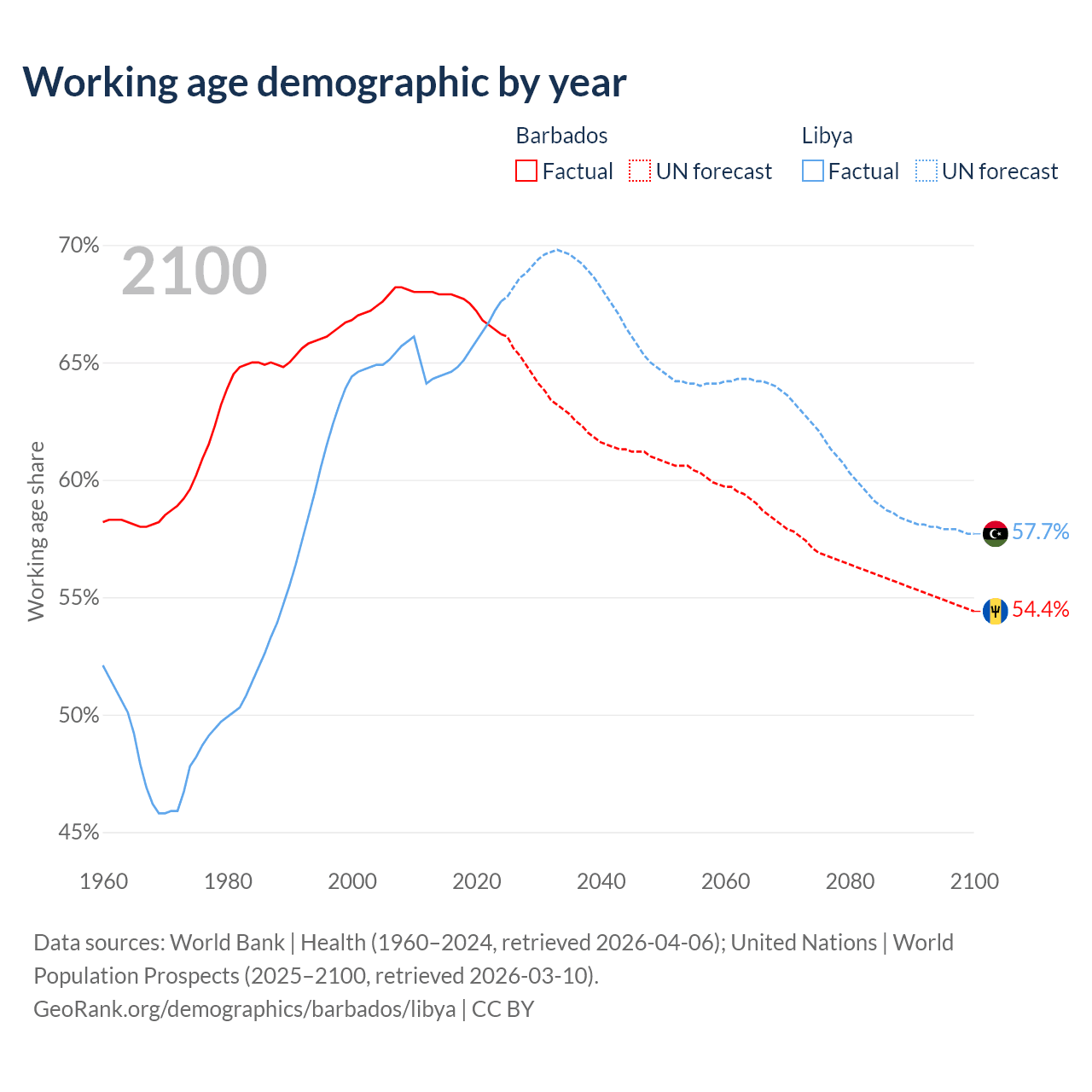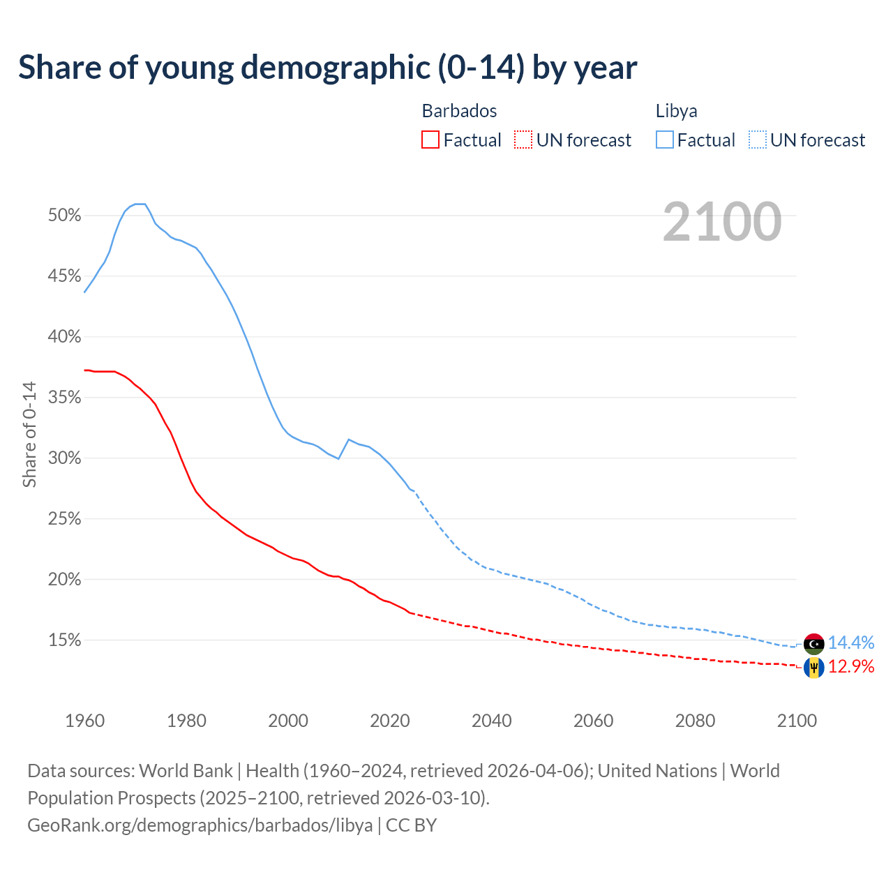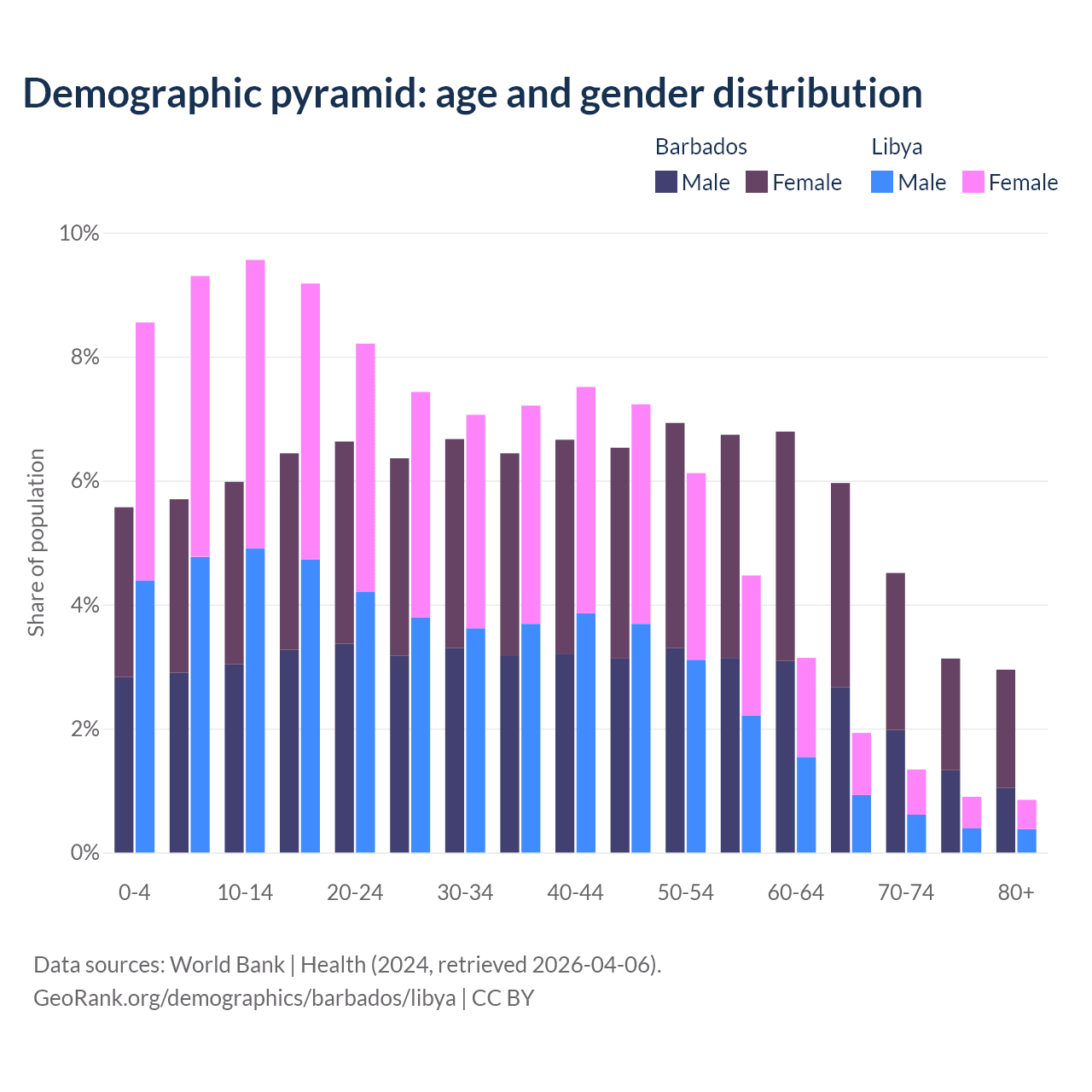 - The share of young demographic (0-15 years old) in Barbados is 17.2% vs 27.4% in Libya.