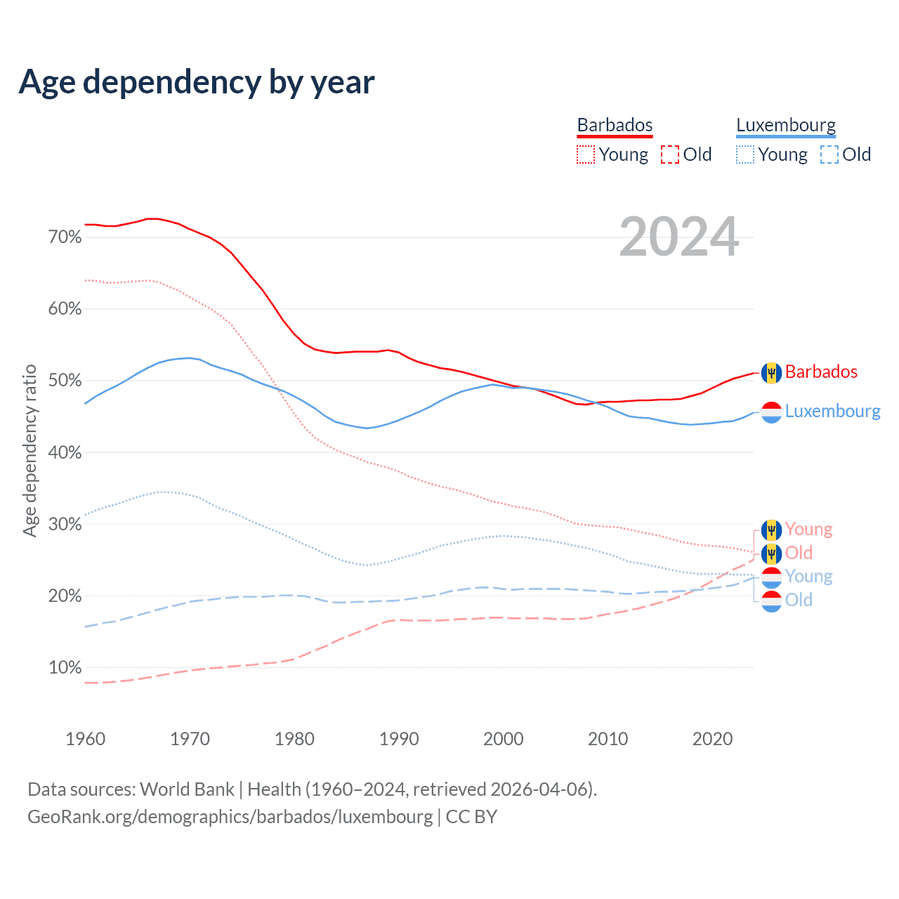 - Barbados is ranked 47/196 by median age (oldest to youngest) vs 46/196 for Luxembourg.